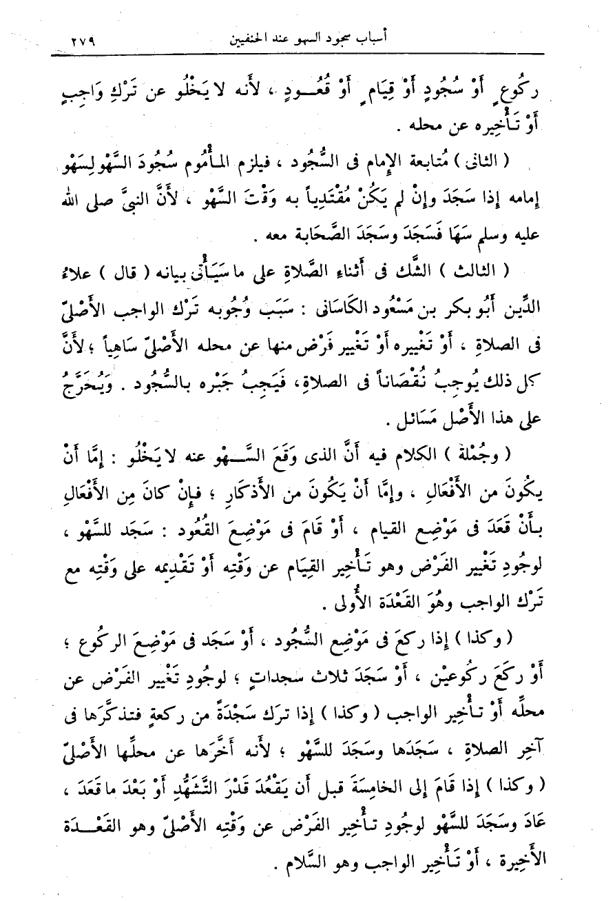 (الثالث) الشك في أثناء الصلاة على ما سيأتي بيانه (قال) علاء الدين أبو بكر بن مسعود الكاساني: سبب وجوبه ترك الواجب الأصلي ساهياً؛ لأن كل ذلك يوجب نقصاناً في الصلاة، فيجب جبره بالسجود. ويخرج على هذا الأصل مسائل.