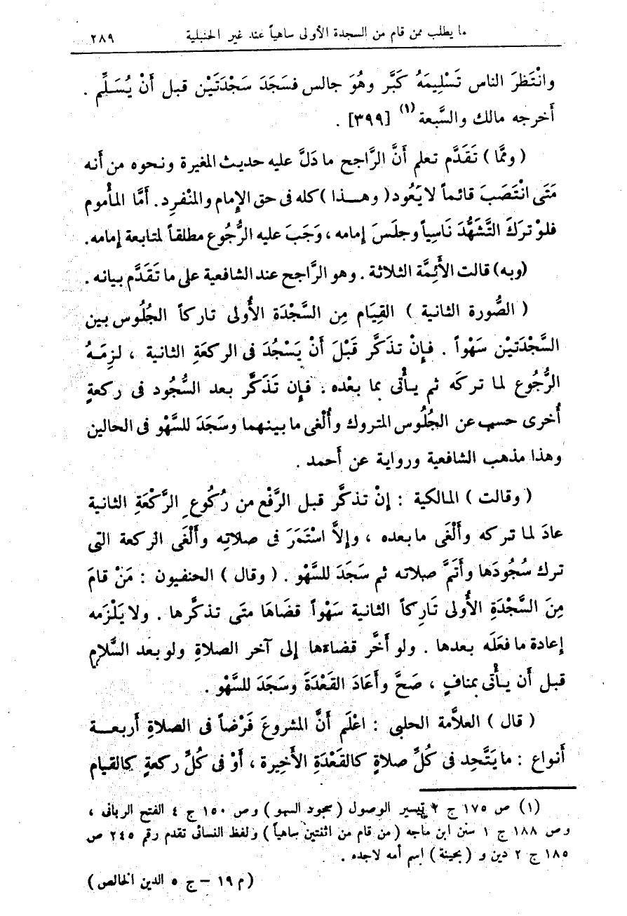 (الصورة الثانية) القيام من السجدة الأولى تاركاً الجلوس بين السجدتين سهواً. فإن تذكر قبل أن يسجد في الركعة الثانية، لزمه الرجوع لما تركه ثم يأتي بما بعده. فإن تذكر بعد السجود في ركعةٍ أخرى حسب عن الجلوس المتروك وألغي ما بينهما وسجد للسهو في الحالين وهذا مذهب الشافعية ورواية عن أحمد.
