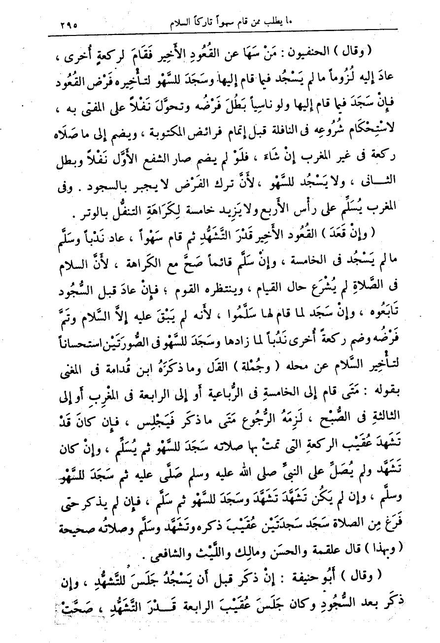 (وإن قعد) القعود الأخير قدر التشهد ثم قام سهواً، عاد ندباً وسلم ما لم يسجد في الخامسة، وإن سلم قائماً صح مع الكراهة، لن السلام في الصلاة لم يشرع حال القيام، وينتظره القوم؛ فإن عاد قبل السجود تابعوه، وإن سجد لما قام لها سلموا، لأنه لم يبق عليه إلا السلام وتم فرضه وضم ركعةً أخرى ندباً لما زادها وسجد للسهو في الصورتين استحساناً لتأخير السلام عن محله (وجملة) القل وما ذكره ابن قدامة في المغنى بقوله: متى قام إلى الخامسة في الرباعية أو إلى الرابعة في المغرب أو إلى الثالثة في الصبح، لزمه الرجوع متى ما ذكر فيجلس، فإن كان قد تشهد عقيب الركعةِ التي تمت بها صلاته سجد للسهو ثم يسلِّم، وإن كان تشهد ولم يصلِّ على النبي صلى الله عليه وسلم صلى عليه ثم سجد للسهو وسلَّم، وإن لم يكن تشهَّد وسَجَدَ للسهو ثم سلم، فإن لم يذكر حتى فرغ من الصلاة سجَد سجدتين عقيب ذكره وتشهد وسلم وصلاته صحيحة (وبهذا) قال علقمة والحسَن ومالِك والليْث والشافعي.