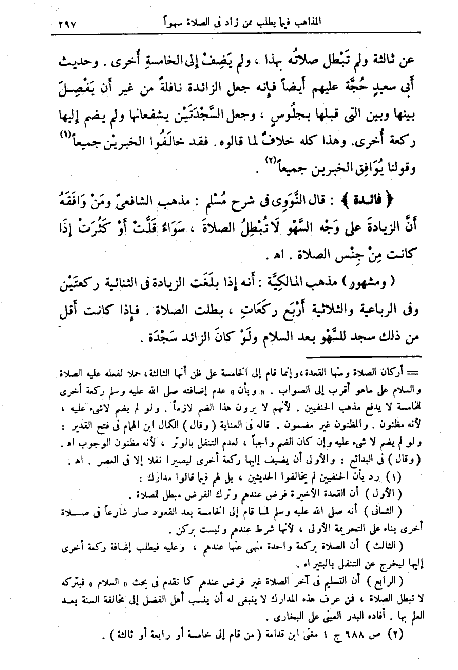 (فائدة): قال النووي في شرح مسلم: مذهب الشافعي ومن وافقه أن الزيادة على وجه السهو لا تبطل الصلاة، سواءٌ قلت أو كثرت إذا كانت من جنس الصلاة. اهـ.