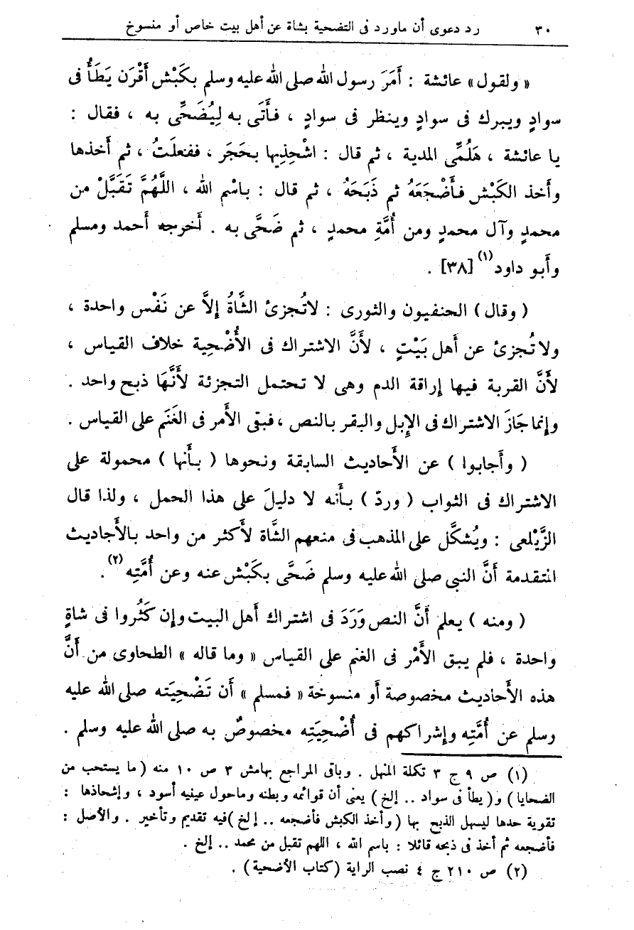 (وأَجابوا) عن الأَحاديث السابقة ونحوها (بأَنها) محمولة على الاشتراك فى الثواب (وردّ) بأَنه لا دليلَ على هذا الحمل، ولذا قال الزَّيْلعى: ويُشكَّل على المذهب فى منعهم الشَّاة لأَكثر من واحد بالأَجاديث المتقدمة أَنَّ النبى صلى الله عليه وسلم ضَحَّى بكَبْش عنه وعن أُمَّتِه (¬2).