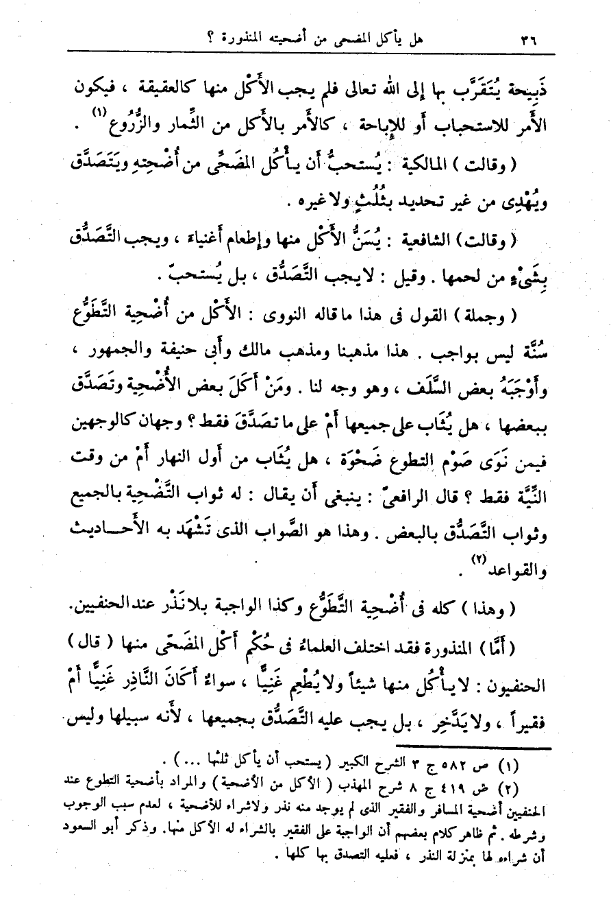 (وجملة) القول فى هذا ما قاله النووى: الأَكْل من أُضْحِية التَّطَوُّع سُنَّة ليس بواجب. هذا مذهبنا ومذهب مالك وأَبى حنيفة والجمهور، وأَوْجَبَهُ بعض السَّلَف، وهو وجه لنا. ومَنْ أَكَلَ بعض الأُضْحِية وتَصَدَّق ببعضها، هل يُثَاب على جميعها أَمْ على ما تصدَّقَ فقط؟ وجهان كالوجين فيمن نَوَى صَوْم التطوع ضَحْوَة، هل يُثَاب من أَول النهار أَمْ من وقت النِّيَّة فقط؟ قال الرافعىّ: ينبغى أَن يقال: له ثواب التَّضْحِية بالجميع وثواب التَّصَدُّق بالبعض. وهذا هو الصوَّاب الذى تَشْهَد به الأَحاديث والقواعد (¬2).