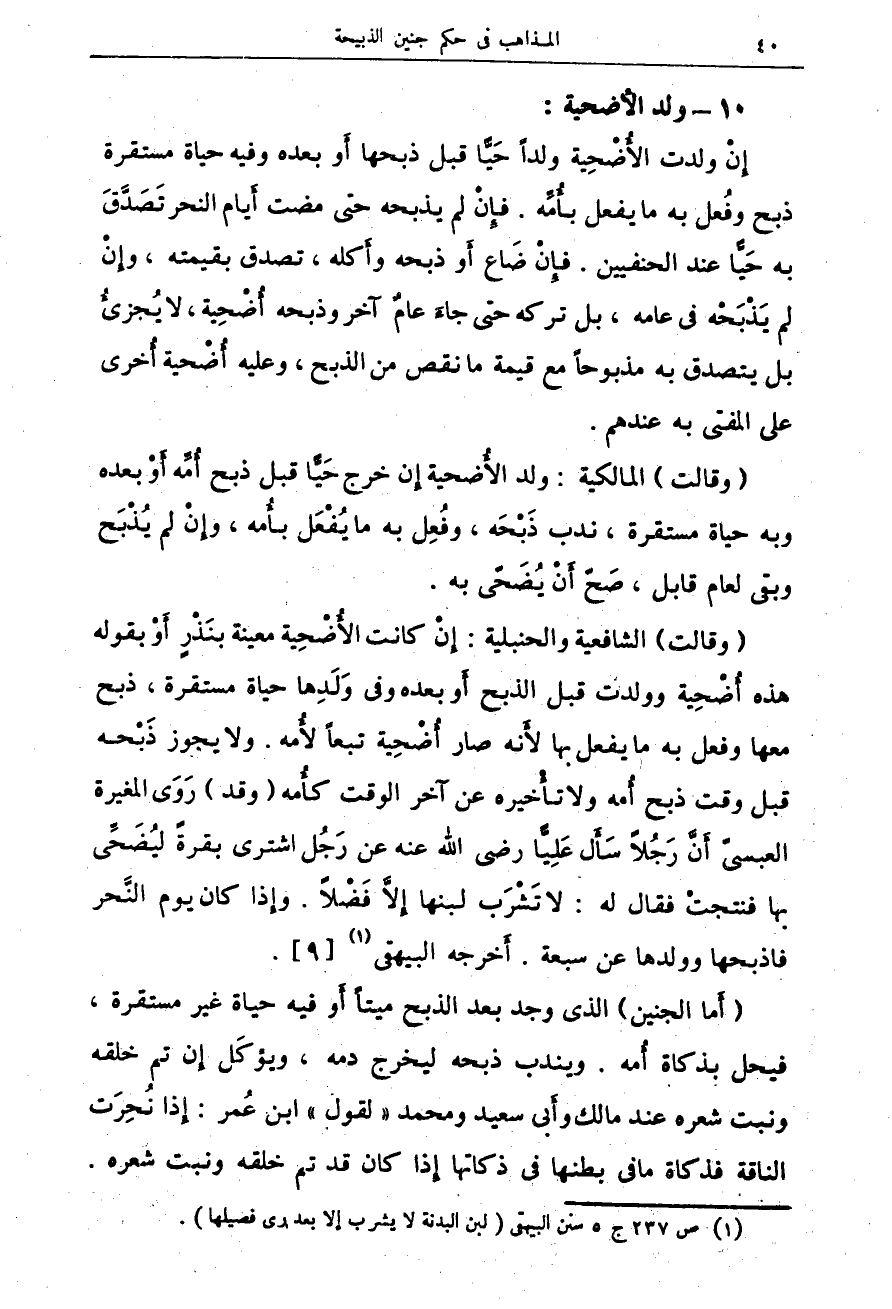 (وقالت) الشافعية والحنبلية: إِنْ كانت الأُضْحِية معينة بنَذْرٍ أَوْ بقوله هذه أُضْحِية وولدت قبل الذبح أَو بعده وفى وَلَلَدِها حياة مستقرة، ذبح معها وفعل به ما يفعل بها لأَنه صار أُضْحِية تبعاً لأُمه. ولا يجوز ذَبْحه قبل وقت ذبح أُمه ولا تأْخيره عن آخر الوقت كأُمه (وقد) رَوَى المغيرة العبسىّ أَنَّ رَجُلاً سَأَل عَلِيًّا رضى الله عنه عن رَجُل اشترى بقرةً ليُضَحِّى بها فنتجتْ فقال له: لا تَشْرَب لبنها إِلاَّ فضْلاً. وإِذا كان يوم النَّحر فاذبحها وولدها عن سبعة. أَخرجه البيهقى (¬1) {9}.