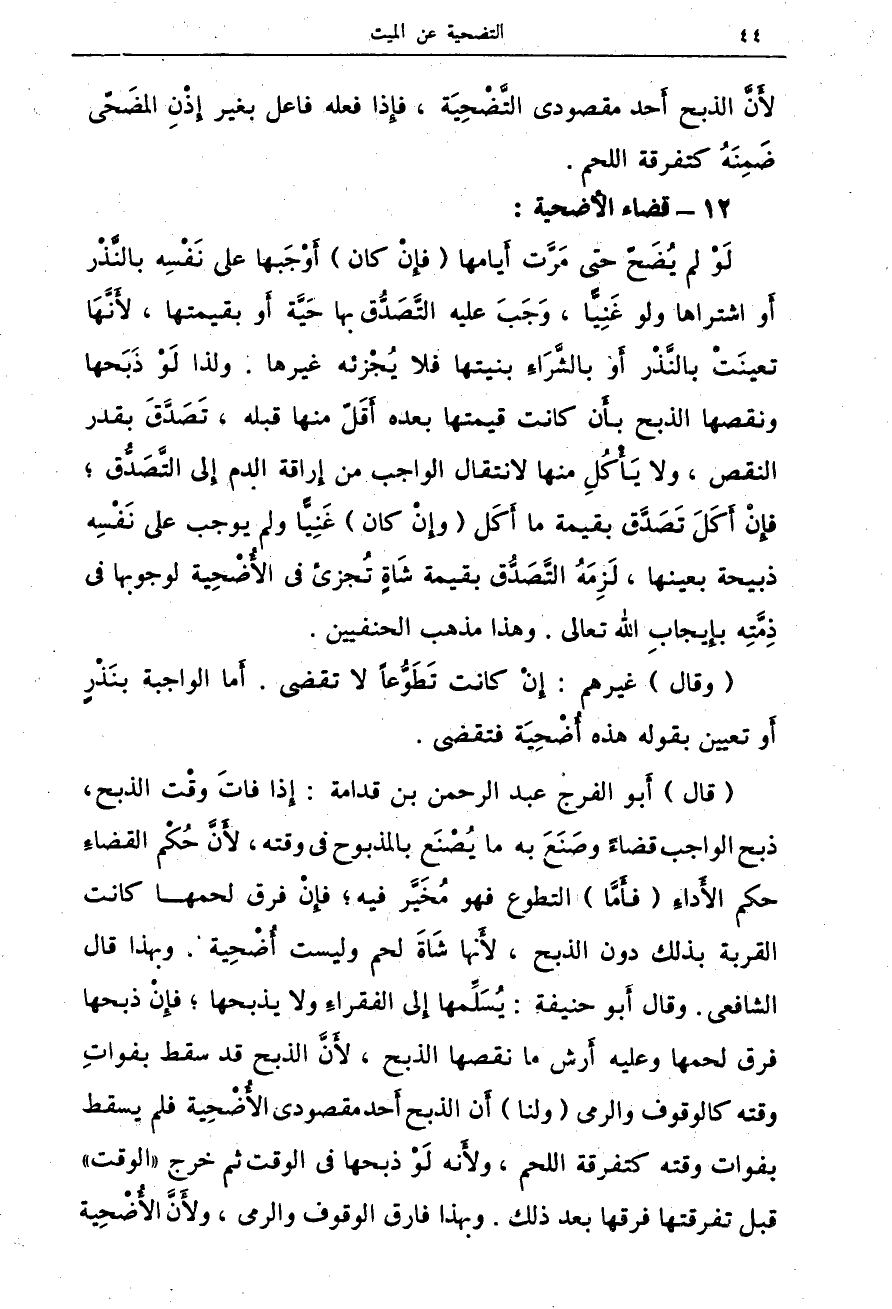 (قال) أَبو الفرج عبد الرحمن بن قدامة: إِذا فاتَ وقْت الذبح، ذبح الواجب قضاءً وصَنَعَ به ما يُصْنَع بالمذبوح فى وقته، لأَنَّ حُكْم القضاءِ حكم الأَداءِ (فأَمَّا) التطوع فهو مُخَيَّر فيه، فإِنْ فرق لحمها كانت القربة بذلك دون الذبح، لأَنها شَاةَ لحم وليست أُضْحِية. وبهذا قال الشافعى. وقال أَبو حنيفة: يُسَلِّمها إِلى الفقراءِ ولا يذبحها، فإِنْ ذبحها فرق لحمها وعليه أَرش ما نقصها الذبح، لأَنَّ الذبح قد سقط بفواتِ وقته كالوقوف والرمى (ولنا) أَن الذبح أَحد مقصودى الأُضْحِية فلم يسقط بفوات وقته كتفرقة اللحم، ولأَنه لأَوْ ذبحها فى الوقت ثم خرج " الوقت " قبل تفرقتها فرقها بعد ذلك. وبهذا فارق الوقوف والرمى، ولأَنَّ الأُضْحِية