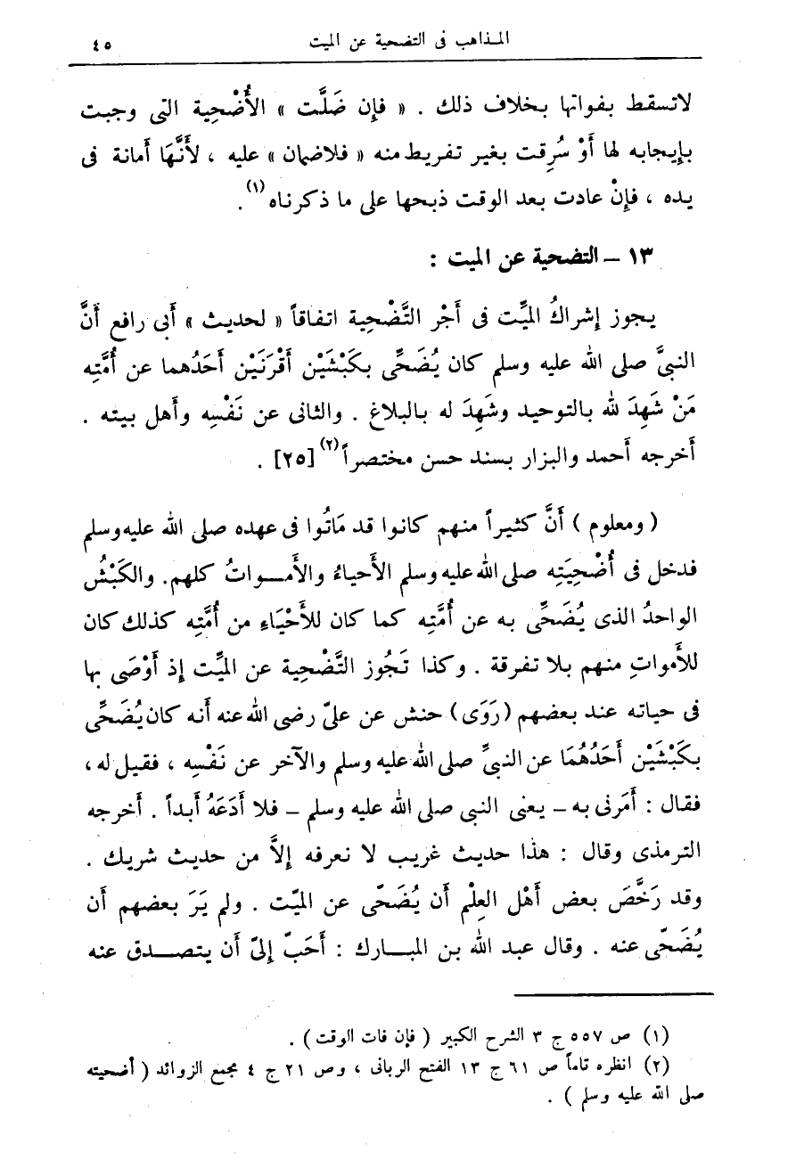 يجوز إِشراكُ المِّيت فى أَجْر التَّضْحِية اتفاقاً " لحديث " أَبى رافع أَنَّ النبىَّ صلى الله عليه وسلم كان يُضَحِّى بكَبْشَيْن أَقْرَنَيْن أَحَدُهما عن أُمَّتِه مَنْ شَهِدَ لله بالتوحيد وشَهِدَ له بالبلاغ. والثانى عن نَفْسِه وأَهل بيته. أَخرجه أَحمد والبزار بسند حسن مختصراً (¬2) {25}.