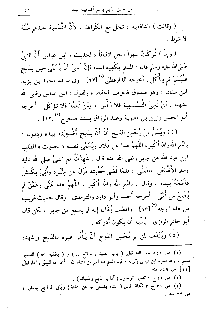 (¬1) ص 549 سنن الدارقطنى (باب الصيد والذبائح .. ) و (يكفيه اسمه) الضمير للمسلم، وقد فسره ابن عباس بقوله: فإن المسلم فيه اسم من أسماء الله. أخرجه البيهقى والدارقطنى [11] ص 549 منه.