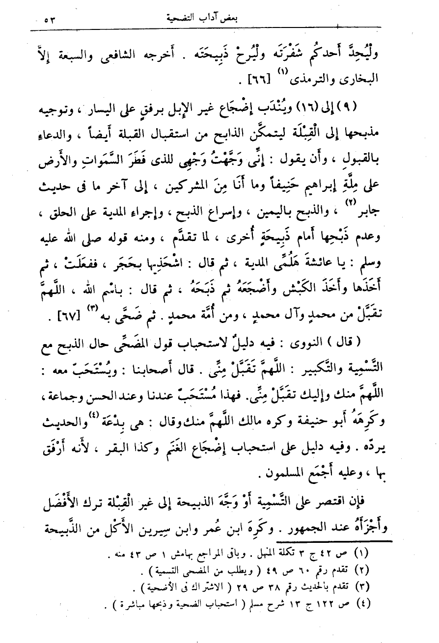 (9) إِلى (16) ويُنْدَب إِضْجَاع غير الإِبل برفقٍ على اليسار، وتوجيه مذبحها إِلى الْقِبْلَة ليتمكِّن الذابح من استقبال أَيضاً، والدعاءِ بالقبولِ، وأَن يقول: إِنِّى وَجَّهْتُ وَجْهِى للذى فَطَرَ السَّمَواتِ والأَرض على مِلَّةِ إِبراهيم حَنِيفاً وما أَنَا مِنَ المشركين، إِلى آخر ما فى حديث جابر (¬2)، والذبح باليمين، وإِسراع الذبح، وإِجراءِ المدية على الحلق، وعدم ذَبْحِها أَمام ذَبِيحَةٍ أُخرى، لما تقدَّم، ومنه قوله صلى الله عليه وسلم: يا عائشةَ هَلُمِّى المدية، ثم قال: اشْحَذِيها بحَجَر، ففعَلَتْ، ثم أَخَذَها وأَخَذَ الكَبْش وأَضْجَعَهُ ثم ذَبَحَهُ، ثم قال: باسْم الله، اللَّهمَّ تقَبَّلْ من محمدٍ وآل محمدٍ، ومن أُمَّة محمدٍ. ثم ضَحَّى به (¬3) {67}.