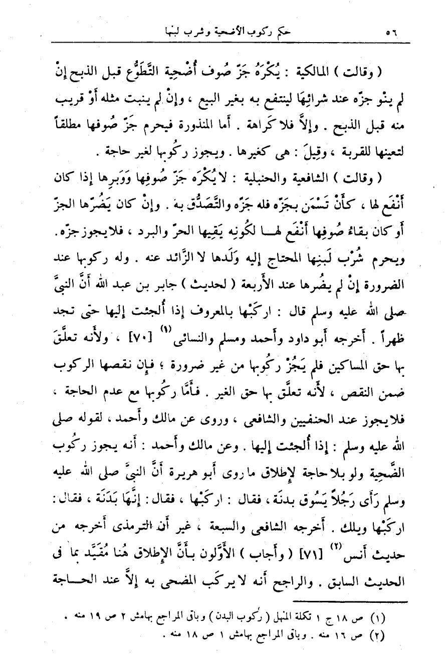 (وقالت) الشافعية والحنبلية: لا يُكْرَه جَزّ صُوفِها وَوَبرِها إِذا كان أَنْفَع لها، بقاءُ صُوفِها أَنْفَع لها لكُونِه يَقِيها الحرَ والبرد، فلا يجوز جزّه. ويحرم شُرْب لَبنِها المحتاج إِليه وَلَدها لا الزَّائد عنه. وله ركوبها عند الضرورة إِنْ لم يضُرها عند الأَربعة (لحديث) جابر بن عبد الله أَنَّ النبىَّ صلى الله عليه وسلم قال: اركَبْها بالمعروف إِذا أُلجئت إِليها حتى تجد ظهراً. أَخرجه أَبو داود وأَحمد ومسلم والنسائى (¬1) {70}، ولأَنه تعلَّقَ بها حق المساكين فلم يَجُزْ ركُوبها من غير ضرورة، فإِن نقصها الركوب ضمن النقص، لأَنه تعلَّق بها حق الير. فأَمَّا ركُوبها م عدم الحاجة، فلا يجوز عند الحنفيين والشافعى، وروى عن مالك وأّحمد لقوله صلى الله عليه وسلم: إِذا أُلجت إِليها. وعن مالك وأَحمد: أَنه يجوز ركُوب الضَّحِية ولو بلا حاجة لإِطلاق ما روى أَبو هريرة أَنَّ النبىَّ صلى اله عليه وسلم رَأَى رَجُلاً يَسُوق بدنَة، فقال: اركَبْها، فقال: إِنَّهَا بَدَنَة، فقال: اركَبْها ويلك. أَخرجه الشافعى والسبعة، غير أَن الترمذى أَخرجه من حديث أَنس (¬2) {71} (وأَجاب) الأَوَّلون بأَنَّ الإِطلاق هُنا مُقَيَّد بما فى الحديث السابق. والراجح أَنه لا يركَب المضحى به إِلاّ عند الحاجة