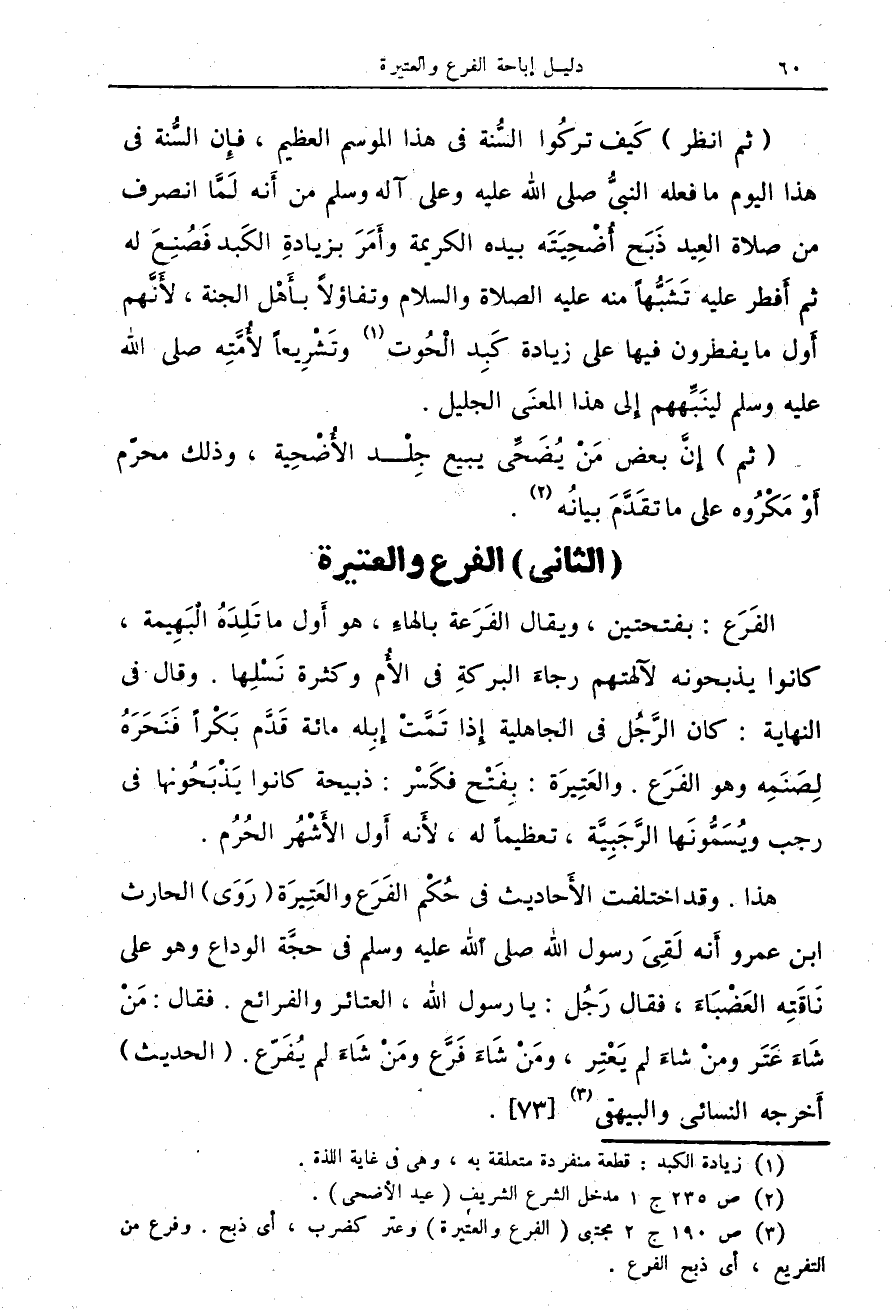 هذا. وقد اختلفت الأَحاديث فى حُكْم الفَرعَ والعَتِيرَة (رَوَى) الحارث ابن عمرو أَنه لَقِىَ رسول الله صلى الله عليه وسلم فى حجَّة الوداع وهو على نَاقَتِه العَضْبَاءَ، فقال رَجُل: يا رسول الله، العتائر والفرائع. فقال: مَنْ شَاءَ عَتَر ومنْ شاءَ لم يَعْتِر، ومَنْ شَاءَ فَرَّع ومِنْ شَاءَ لم يُفَرّع. (الحديث) أَخرجه النسائي والبيهقى (¬3) {73}.