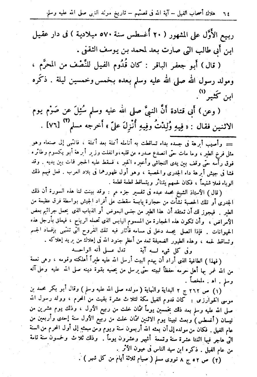(قال) أَبو جعفر الباقر: كان قُدُوم الفيل للنِّصْف من المحرَّم، ومولد رسول الله صلى الله عليه وسلم بعده بخمس وخمسين ليلة. ذكَره ابن كَثير (¬1).