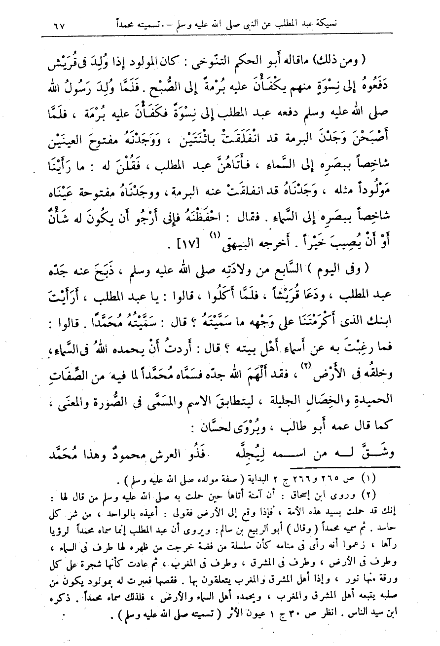 (ومن ذلك) ما قاله أَبو الحكم التنّوخى: كان المولود إِذّا وُلِدَ فى قُرَيْش دَفَعُوهُ إِلى نِسْوَةٍ منهم يكْفَأْنَ عليه بُرْمةً إِلى الصُّبْح. فَلَمَّا وُلِدَ رَسُلُ الله صلى الله عليه وسلم دفعه عبد المطلب إِلى نِسْوَةً فكَفَأْنَ عليه بُرْمَة، فلَمَّا أَصْبَحْنَ وَجَدْنَ البرمة قد انْفَلَقَتْ باثْنَتَيْن، وَوَجَدْنَهُ مفتوحَ العينَيْن شاخِصاً ببصَرِه إِلى السَّماءِ، فأَتَاهُنَّ عبد المطلب، فَقُلْنَ هـ: ما رَأَيْنَا مَوْلُوداً مثله، وَجَدْنَاهُ قد انفلقَتْ عنه البرمة، ووجَدْنَاهُ مفتوحة عَيْنَاه شاخِصاً ببصَرِه إِلى السَّماءِ. فقال: احفْظْنَهُ فإِنى أَرْجُو أَن يكُونَ له شَأْنٌ أَوْ أَنْ يُصِيبَ خَيْراً. أَخرجه البيقى (¬1) {17}.