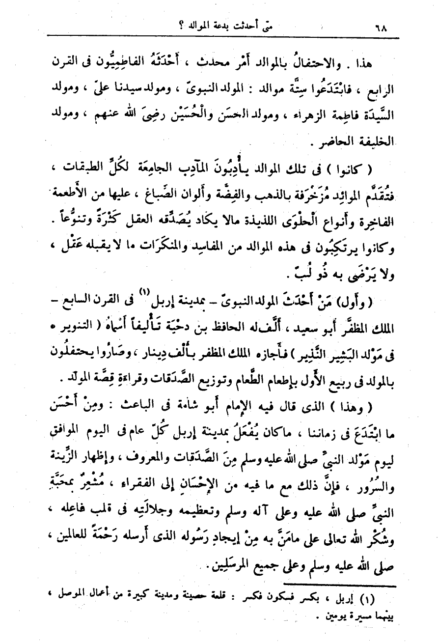 (وهذا) الذى قال فيه الإِمام أَبو شامة فى الباعث: ومِنْ أَحْسَن ما ابْتَدَعَ فى زماننا، ما كان يُفْعَلُ بمدينة إِربل كُلّ عام فى اليوم الموافق ليوم مَوْلد النبىِّ صلى الله عليه وسلم مِنَ الصَّدَقات والمعرف، وإِظهار الزِّينة والسُرُور، فإِنَّ ذلك مع ما فيه من الإحْسَانِ إِلى الفقراءِ، مُسْعِرٌ بمحَبَّةِ النبىِّ صلى الله عليه وعلى آله وسلم وتعظيمه وجلالَتِه فى قلب فاعِله، وشُكْر الله تعالى على ما مَنَّ به مِنْ إيجاد رَسُوله الذى أَرسله رَحْمَةً للعالمين، صلى الله عليه وسلم وعلى جميع المرسَلِين.