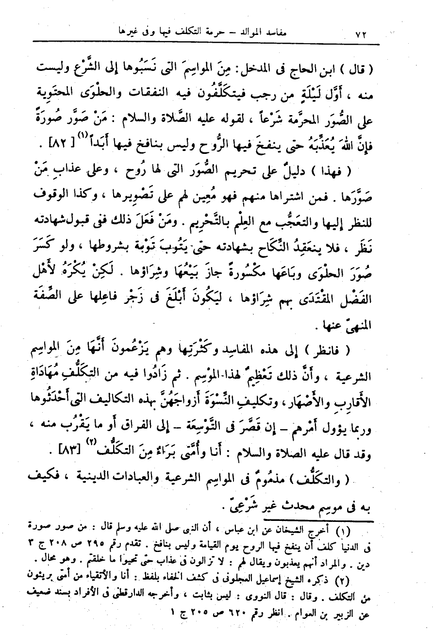 (فانظر) إِلى هذه المفاسِد وكَثْرَتِها وهم يَزْعُمونَ أَنَّهَا مِنَ المواسِم الشرعية، وأَنَّ ذلك تَعْظِيمٌ لهذا المؤْسِم. ثم زَادُوا فيه من التكَلُّفِ مُهَادَاةِ الأَقارِبِ والأَصْهَار، وتكليفِ النِّسْوَةَ أَزواجَهُنِّ بهذه التكاليف التى أَحْدَثُوها ورما يؤول أَمْرهم - إِن قَصَّرَ فى التَّوْسِعَة - إِلى الفراق أَو ما يَقْرُب منه، وقد قال عليه الصلاة والسلام: أَنا وأُمَّتى بَرَاءٌ مِنَ التكَلُّف (¬2) {83}.