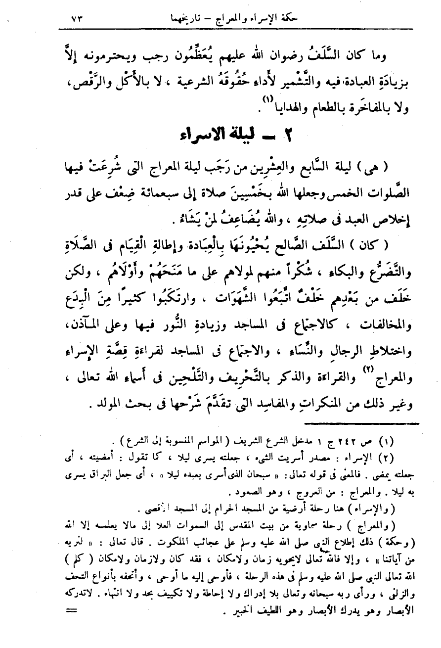 (كان) السَّلَف الصَّالح يُحْيُونَهَا بِلْعِبادة وإِطالةِ الْقِيَام فى الصَّلآةِ والتَّضَرُّع والبكاءِ، شُكْراً منهم لمولاهم على ما مَنَحَهُمْ وأَوْلآهُم، ولكن خَلف من بَعْدِهم خَلْفٌ اتَّبَعُوا الشَّهَوَات، وارتَكَبُوا كثيراً مِنَ الْبِدَع والمخالفات، كالاجتمع فى المساجد وزيادةِ النُّور فيها وعلى المآذن، واختلاط الرجال والنِّسَاءِ، والاجتماع فى المساجد لقراءَةِ قِصَّةِ الإِسراءِ والمعراج (¬2)