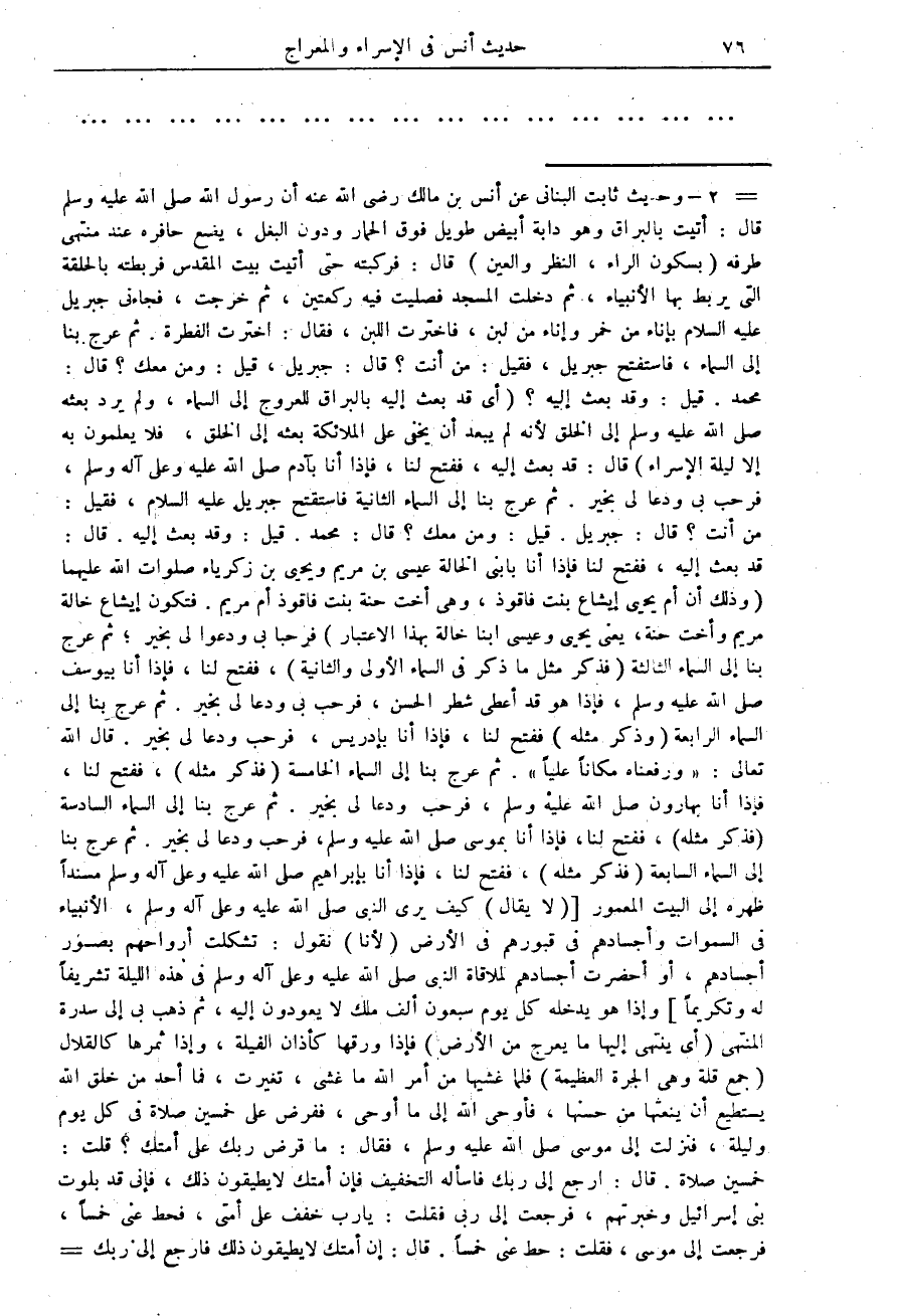 2 - وحديث ثابت البنانى عن أنس بن مالك رضى الله عنه أن رسول الله صلى الله عليه وسلم قال: أتيت بالبراق وهو دابة طويل فوق الحمار ودون البغل، يضع حافره عند منتهى طرفه (بسكون الراء، النظر والعين) قال: فركبته حتى أتيت المقدس فربطته بالحلقة التى يربط بها الأنبياء، ثم دخلت المسجد فصليت فيه ركعتين، ثم خرجت، فجاءنى جبريل عليه السلام بإناء من خمر وإناء من لبن، فاخترت اللبن، فقال: أخترت الفطرة. ثم عرج بنا إلى السماء، فاستفتح جبريل، فقيل: من أنت؟ قال: جبريل، قيل: ومن معك؟ قال: محمد. قيل: وقد بعث إليه؟ (أى قد بعث إليه بالبراق للعروج إلى السماء) (ولم يرد بعثه صلى الله عليه وسلم إلى الخلق لأنه لم يبعد أن يخفى على الملائكة بعثه إلى الخلق، فلا يعلمون به إلا ليلة الإسراء) قال: قد بعث إليه ففتح لنا، فإذا أنا بآدم صلى الله عليه وعلى آله وسلم، فرحب بى ودعا لى بخير. ثم عرج بنا إلى السماء الثانية فاستفتح جبريل عليه السلام، فقيل: من أنت؟ قال: جبريل. قيل: ومن معك؟ قال: محمد. قيل: وقد بعث إليه. قال: قد بعث إليه، ففتح لنا فإذا أنا بابنى الخالة عيسى بن مريم ويحيى بن زكرياء صلوات الله عليهما (وذلك أن أم يحيى إيشاع بنت فاقوذ، وهى أخت حنة بنت فاقوذ أم مريم. فتكون إيشاع خالة مريم وأخت حنة، يعنى يحيى وعيسى ابنا خالة بهذا الاعتبار) فرحبا بى ودعوا لى بخير، ثم عرج بنا إلى السماء الثالثة (فذكر مثل ما ذكر فى السماء الأولى والثانية)، ففتح لنا، فإذا أنا بيوسف صلى الله عليه وسلم، فإذا هو قد أعطى شطر الحسن، فرحب بى ودعا لى بخير. ثم عرج بنا إلى السماء الرابعة (وذكر مثله) ففتح لنا، فإذا أنا بإدريس، فرحب ودعا لى بخير. قال الله تعالى: " ورفعناه مكاناً علياً ". ثم عرج بنا إلى السماء الخامسة (فذكر مثله)، ففتح لنا، فإذا أنا بهارون صلى الله عليه وسلم، فرحب ودعا لى بخير. ثم عرج بنا إلى السماء السادسة (فذكر مثله)، ففتح لنا، فإذا أنا بموسى صلى الله عليه وسلم، فرحب ودعا لى بخير. ثم عرج بنا إلى السماء السابعة (فذكر مثله)، ففتح لنا، فإذا أنا بإبراهيم صلى الله عليه وعلى آله وسلم مسنداً ظهره إلى البيت المعمور [(لا يقال) كيف يرى النبى صلى الله عليه وعلى آله وسلم، الأنبياء فى السموات وأجسادهم فى قبورهم فى الأرض (لأنا) نقول: تشكلت أرواحهم بصور أجسادهم، أو أحضرت أجسادهم لملاقاة النبى صلى الله عليه وعلى آله وسلم فى هذه الليلة تشريفاً له وتكريماً] وإذا هو يدخله كل يوم سبعون ألف ملك لا يعودون إليه، ثم ذهب بى إلى سدرة المنتهى (أى ينتهى إليها ما يعرج من الأرض) فإذا ورقها كأذان الفيلة، وإذا ثمرها كالفلال (جمع قلة وهى الجرة العظيمة) فلما غشيها من أمر الله ما غشى، تغيرت، فما أحد من خلق الله يستطيع أن ينعتها من حسنها، فأوحى الله إلى ما أوحى، ففرض على خمسين صلاة فى كل يوم وليلة، فنزلت إلى موسى صلى الله عليه وسلم، فقال: ما فرض ربك على أمتك؟ قلت: خمسين صلاة. قال: ارجع إلى ربك فاسأله التخفيف فإن أمتك لا يطيقون ذلك، فإنى قد بلوت بنى إسرائيل وخبرتهم، فرجعت إلى ربى فقلت: يارب خفف على أمتى، فحط عنى خمساً، فرجعت إلى موسى، فقلت: حط عنى خمساً. قال إن أمتك لا يطيقون ذلك فارجع إلى ربك =