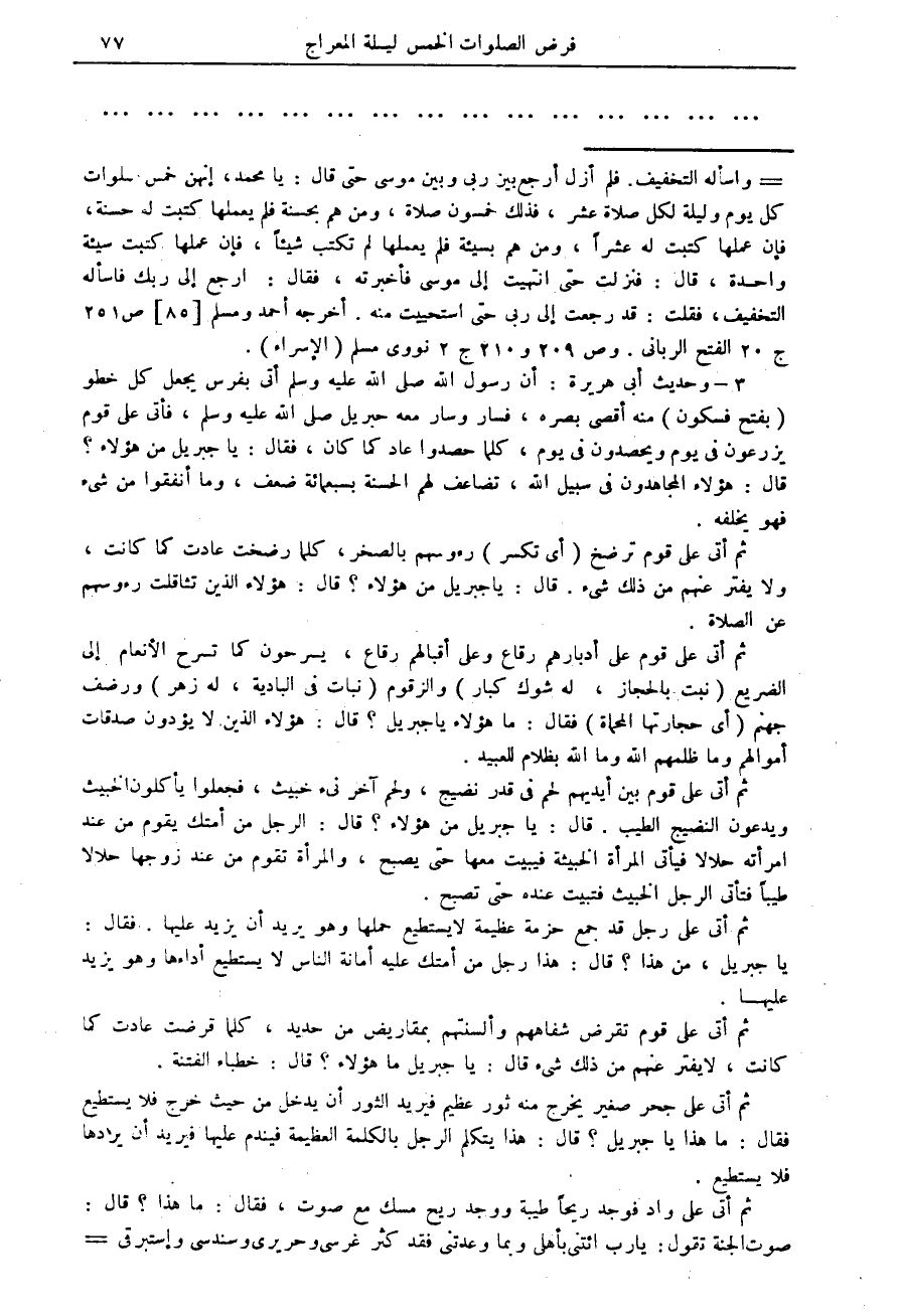 = واسأله التخفيف. فلم أزل أرجع بين ربى وبين موسى حتى قال: يا محمد، إنهن خمس صلوات كل يوم وليلة لكل صلاة عشر، فذلك خمسون صلاة، ومن هم بحسنة فلم يعملها كتبت له حسنة، فإن عملها كتبت له عشراً، ومن هم بسيئة فلم يعملها لم تكتب شيئاً فإن عملها كتبت سيئة واحدة، قال: فنزلت حتى انتهيت إلى موسى فأخبرته، فقال: ارجع إلى ربك فاسأله التخفيف، فقلت: قد رجعت إلى ربى حتى استحييت منه. أخرجه أحمد ومسلم [85] ص 251 ج 20 الفتح الربانى. وص 209 و 210 ج 2 نووى مسلم (الإسراء).