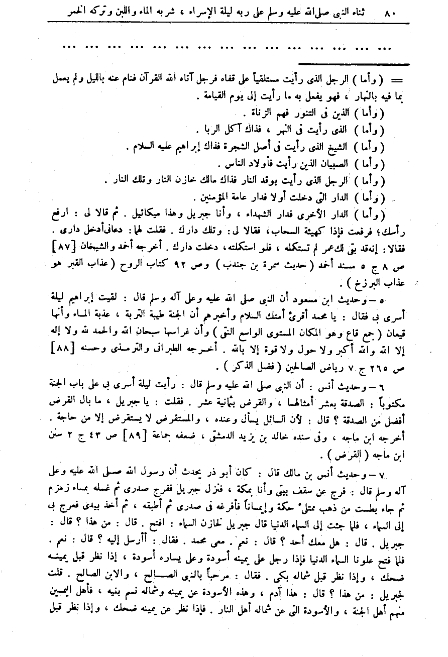 7 - وحديث أنس بن مالك قال: كان ابو ذر يحدث أن رسول الله صلى الله عليه وعلى آله وسلم قال: فرج عن سقف بيتى وأنا بمكة، فنزل جبريل ففرج صدرى ثم غسله بماء زمزم ثم جاء بطست من ذهب ممتلئ حكمة وإيماناً فأفرغه فى صدرى ثم أطبقه، ثم أخذ بيدى فعرج بى إلى السماء، فلما جئت إلى السماء الدنيا قال جبريل لخازن السماء افتح. قال: من هذا؟ قال: جبريل. قال: هل معك أحد؟ قال: نعم معى محمد. فقال: أرسل إليه؟ قال نعم. فلما فتح علونا السماء الدنيا فإذا رجل على يمينه أسودة وعلى يساره أسودة، إذا نظر قبل يمينه ضحك، وإذا نظر شماله بكى. فقال: مرحباً بالنبى الصالح، والابن الصالح. قلت لجبريل: من هذا؟ قال: هذا آدم، وهذه الأسودة عن يمينه وشماله نسم بنيه، فأهل اليمين منهم أهل الجنة، والأسودة التى عن شماله أهل النار. فإذا نظر عن يمينه ضحك، وإذا نظر قبل =