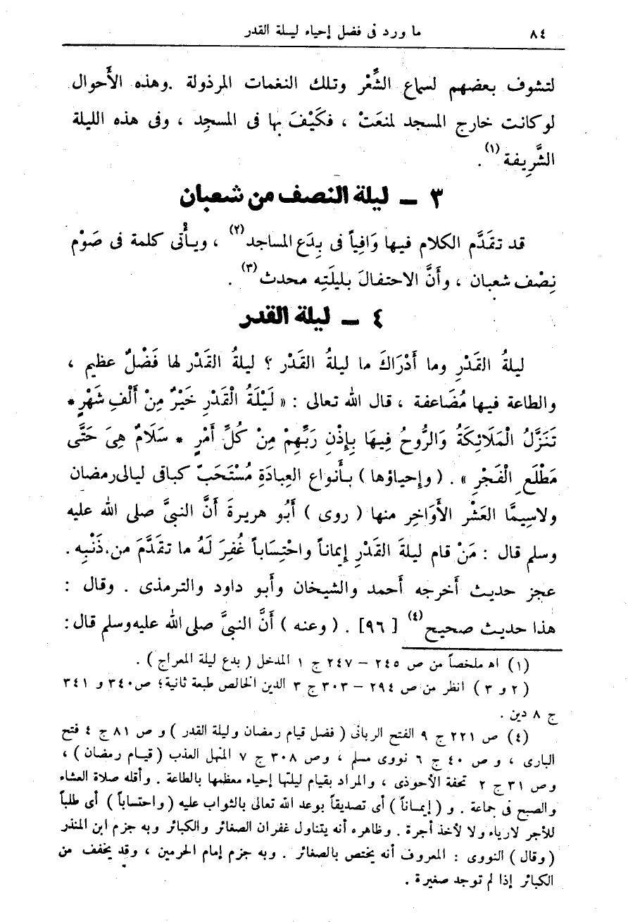 قد تقَدَّم الكلام فيها وَافِياً فى بِدَع المساجد (¬2)، ويأْتى كلمة فى صَوْم نِصْف شعبان، وأَنَّ الاحتفالَ بليلَتِه محدث (¬3).