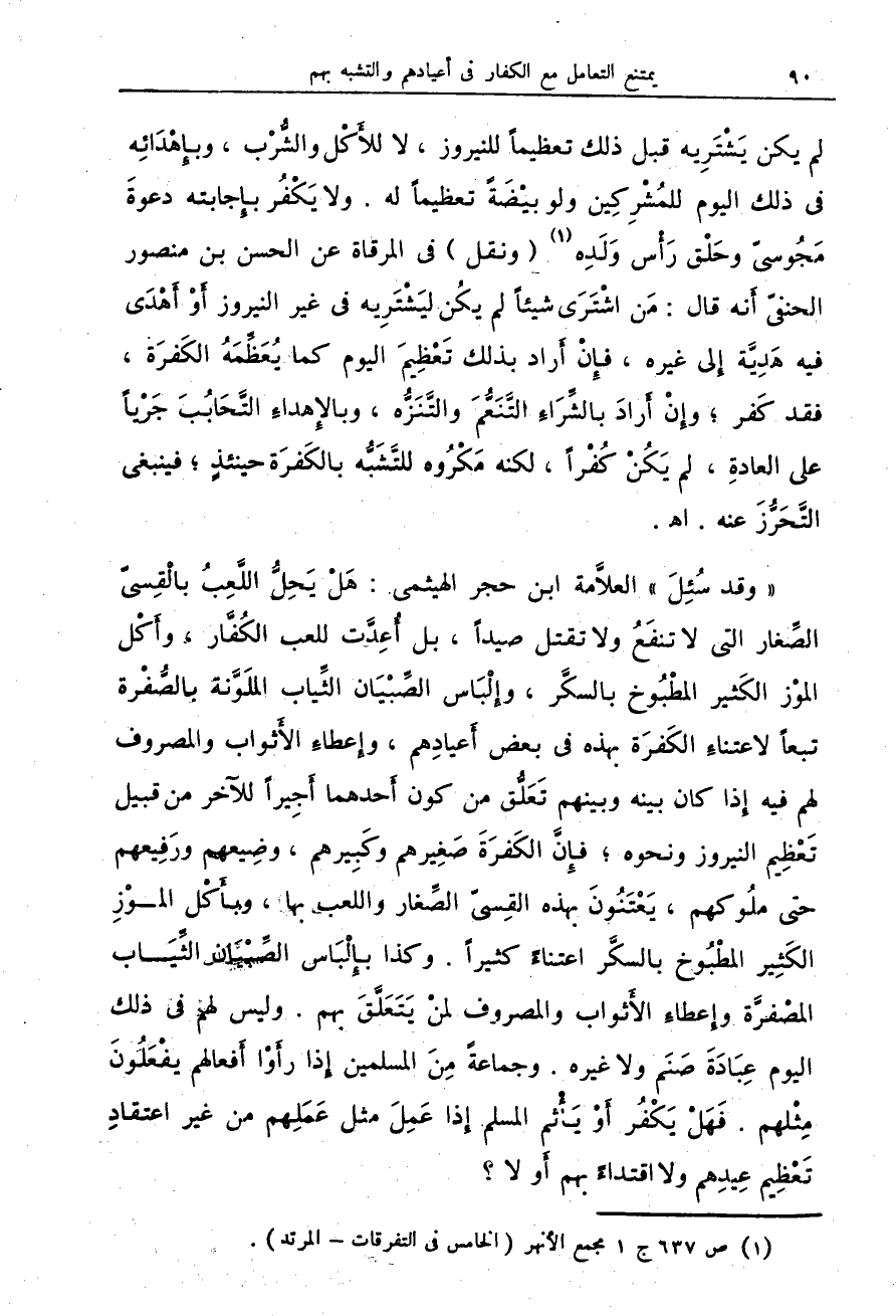 " وقد سُئِلَ " العلاَّمة ابن حجر الهيثمى: هَلْ يَحِلُ اللَّعِبُ بالْقِسىّ الصِّغار التى لا تنفَعُ ولا تقتل صيداً، بل أُعِدَّت للعب الكُفَّار، وأَكْل الموْز الكَثير المطْبُوخ بالسكَّر، وإِلْبَاس الصِّبْيَان الثِّياب الملَوَّنة بالصُّفْرة تبعاً لاعتناءِ الكَفرَة بهذه فى بعض أَعيادِهم، وإِعطاءِ الأَثواب والمصروف لهم فيه إِذا كان بينه وبينهم تَعَلُّق من كون أَحدهما أَجِيراً للآخر من قبيل تَعْظِيم النيروز ونحوه، فإِنَّ الكَفرَةَ صَغِيرهم وكَبِيرهم، وضِيعهم ورَفِعهم حتى ملُوكهم، يَعْتَنُونَ بهذه القِسىّ الصَّغار واللعب بها، وبأَكْل الموْزِ الكَثِير المطْبُوخ بالسكَّر اعتناءً كثيراً. وكذا بإِلْبَاس الصِّبْيَان الثِّيَاب المصْفرَّة وإِعطاءِ الأَثواب والمصروف لمنْ يَتَعَلَّقَ بهم. وليس لهم فى ذلك اليوم عِبَادَةَ صَنَم ولا غيره. وجماعةً مِنَ المسلمين إِذا رأَوْا أَفعالهم يفْعَلُونَ مِثْلهم. فَهَلْ يَكْفُر أَوْ يَأْثم المسلم إِذا عَمِلَ مثل عَمَلِهم من غير اعتقادِ تَعْظِيم عِيدِهم ولا اقتداءً بهم أَو لا؟
