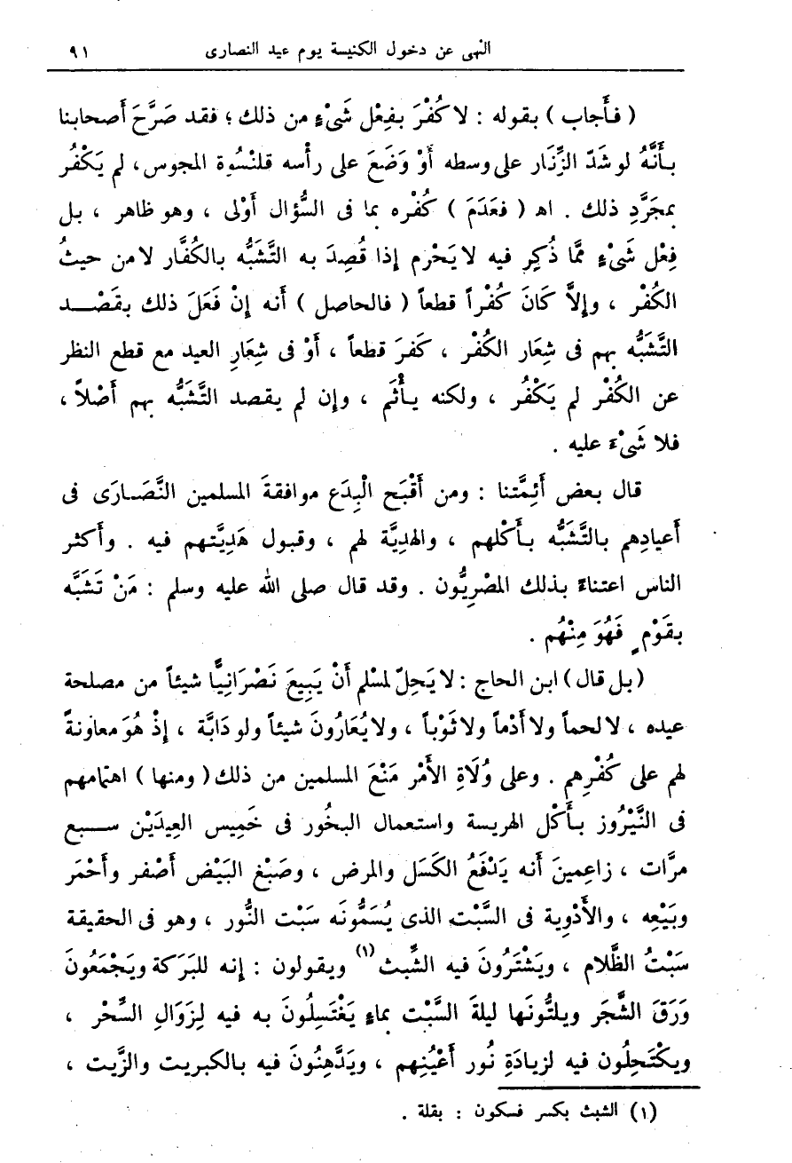 قال بعض أَئِمَّتنا: ومن أَقْبَح الْبِدَع موافقةَ المسلمين النَّصارَى فى أَعيادِهم بالتَّشَبُّه بأَكْلهم، والهدِيَّة لهم، وقبول هَدِيَّتهم فيه. وأَكثر الناس اعتناءً بذلك المصْرِيُّون. وقد قال صلى الله عليه وسلم: مَنْ تَشَبَّه بقَوْمٍ فَهُوَ مِنْهُم.