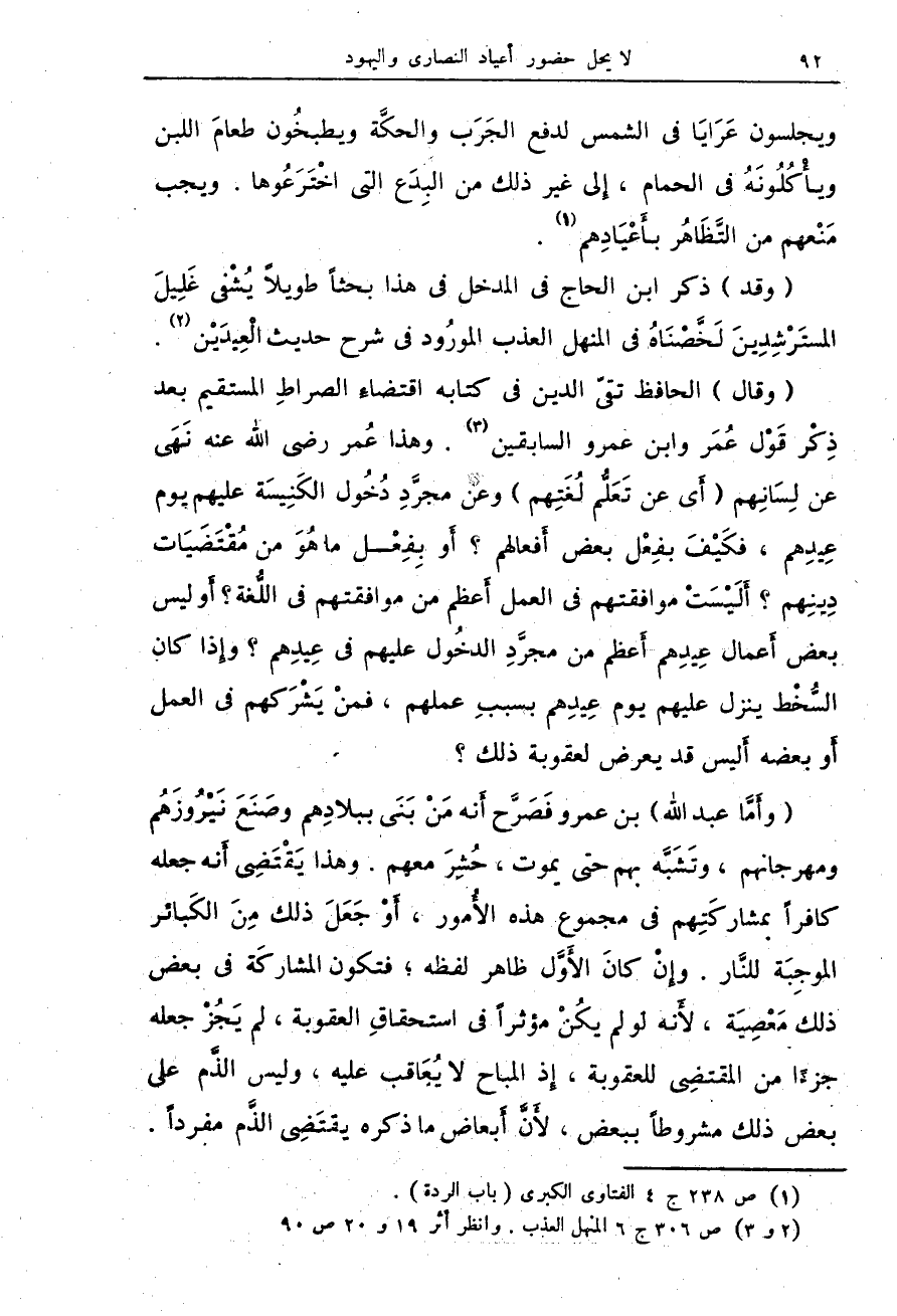 (وأَمَّا عبد الله) بن عمرو فَصَرَّح أَنه مَنْ بَنَى ببلادِهم وصَنَعَ نَيْرُوزَهُم ومهرجانهم، وتَشَبَّه بهم حتى يموت، حُشِرَ معهم. وهذا يَقْتَضِى أَنه جعله كافراً بمشاركَتِهم فى مجموع هذه الأُمور، أَوْ جَعَلَ ذلك مِنَ الكَبائر الموجِبَة للنّار. وإِنْ كانَ الأَوَّل ظاهر لفظه، فتكون المشاركَة فى بعض ذلك مَعْصِيَة، لأَنه لو لم يكُنْ مؤثراً فى استحقاقِ العقوبة، لم يَجُزْ جعله جزءًا من المقتضِى للعقوبة، إِذ المباح لا يُعَاقب عليه، وليس الذَّم على بعض ذلك مشروطاً ببعض، لأَنَّ أَبعاض ما ذكره يقتَضِى الذَّم مفرداً