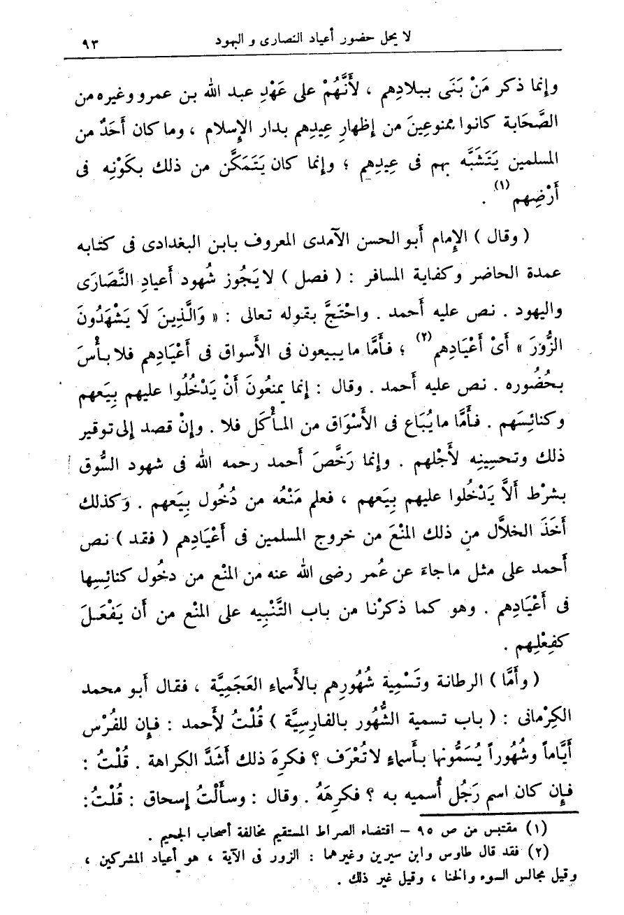 (وقال) الإِمام أَبو الحسن الآمدى المعروف بابن البغدادى فى كتابه عمدة الحاضر وكفاية المسافر: (فصل) لا يَجُوز شُهود أَعيادِ النَّصَارَى واليهود. نص عليه أَحمد. واحْتَجَّ بقوله تعالى: " وَالَّذِينَ لآ يَشْهَدُونَ الزُّورَ" أَىْ أَعْيَادِهم (¬2)، فأَمَّا ما يبيعون فى الأَسواق فى أَعْيادِهم فلا بأْسَ بحُضُوره. نص عليه أَحمد. وقال: إِنما يمنعُونَ أَنْ يَدْخُلُوا عليهم بِيَعهم وكنائِسَهم. فأَمَّا ما يُبَاع فى الأَسْوَاق من المأْكَل فلا. وإِنْ قصد إِلى توثير ذلك وتحسِينِه لأَجْلهم. وإِنما رَخَّصَ أَحمد رحمه الله فى شهود السُّوق بشرْط أَلاَّ يَدْخُلوا عليهم بِيَعهم، فعلم مَنْعُه من دُخُول بِيَعهم. وكذلك أَخَذَ الخلاَّل من ذلك المنْعَ من خروج المسلمين فى أَعْيَادِهم (فقد) نص أَحمد على مثل ما جاءَ عن عُمر رضى الله عنه من المنْع من دخُول كنائِسِها فى أَعْيَادِهم. وهو كما ذكرْنا من باب التَّنْبِيه على المنْع من أَن يفْعَلَ كفِعْلِهم.