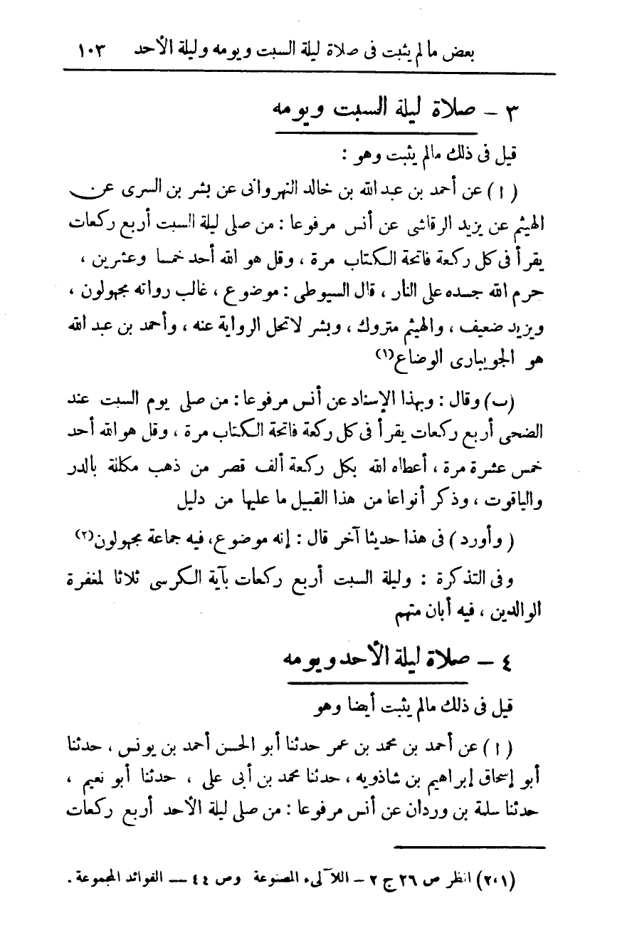 (أ) عن أحمد بن عبد الله بن خالد النهروانى عن بشر بن السرى عن الهيثم عن يزيد الرقاشى عن أنس مرفوعا: من صلى ليلة السبت أربع ركعات يقرأ فى كل ركعة فاتحة الكتاب مرة، وقل هو الله أحد خمسا وعشرين، حرم الله جسده على النار، قال السيوطى: موضوع، غالب روانه مجهولون، ويزيد ضعيف، والهيثم متروك ن وبشر لا تحل الرواية عنه، وأحمد بن عبد الله هو الجويبارى الوضاع (¬1)