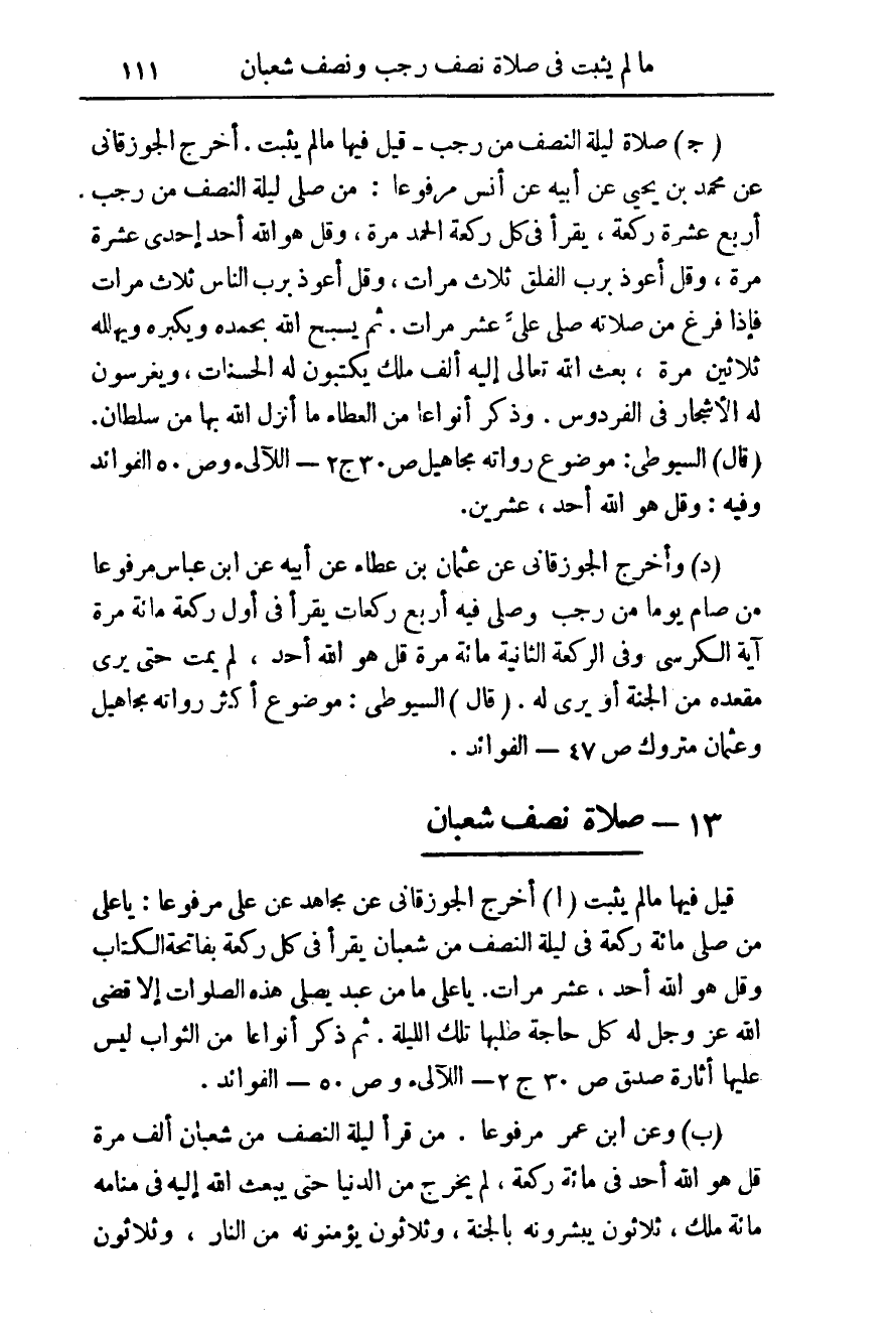 (أ) أخرج الجوزقانى عن مجاهد عن على مرفوعا: يا على من صلى مائة ركعة فى ليلة النصف من