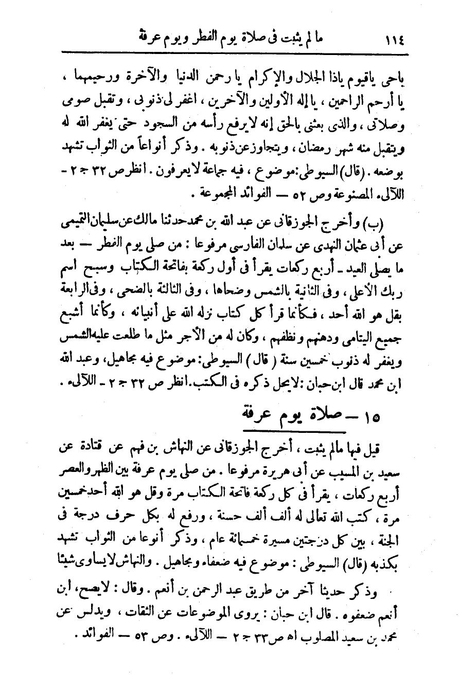 (ب) وأخرج الجوزقانى عن عبد الله بن محمد حدثنا مالك عن سليمان التميمى عن أبى عثمان النهدى عن سلمان الفارسى مرفوعا: من صلى يوم الفطر - بعدما يصلى العيد - أربع ركعات يقرأ فى أول ركعة بفاتحة الكتاب وسبح اسم ربك الأعلى، وفى الثانية بالشمس وضحاها، وفى الثالثة بالضحى، وفى الرابعة بقل هو الله أحد، فكأنما قرأ كل كتاب نزله الله على أنبيائه، وكأنما أشبع جميع اليتامى ودهنهم ونظفهم، وكان له فى الأجر مثل ما طلعت عليه الشمس ويغفر له ذنوب خمسين سنة (قال) السيوطى: موضوع فيه مجاهيل، وعبد الله ابن محمد قال ابن حبان: لا يحل ذكره فى الكتب. انظر ص 32 ج 2 - اللآلى.