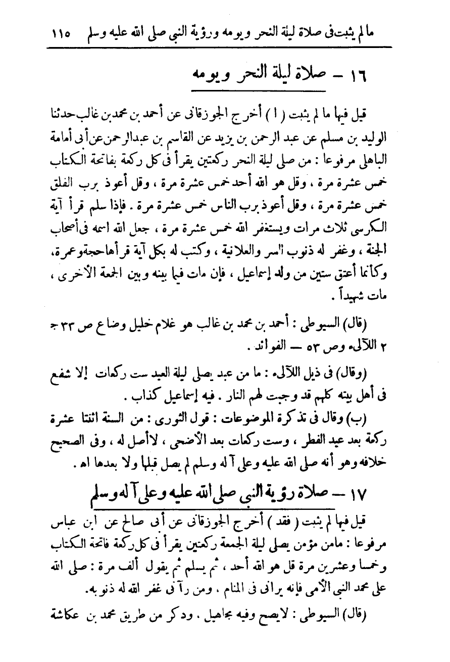قيل فيها ما لم يثبت (أ) أخرج الجوزقانى عن ابى صالح عن ابن عباس مرفوعا: ما من مؤمن يصلى ليلة الجمعة ركعتين يقرأ فى كل ركعة فاتحة الكتاب وخمسا وعشرين مرة قل هو الله أحد، ثم يسلم ثم يقول آلف مرة: صلى الله على محمد النبى الأمى فإنه يرانى فى المنام. ومن رآنى غفر الله له ذنوبه.