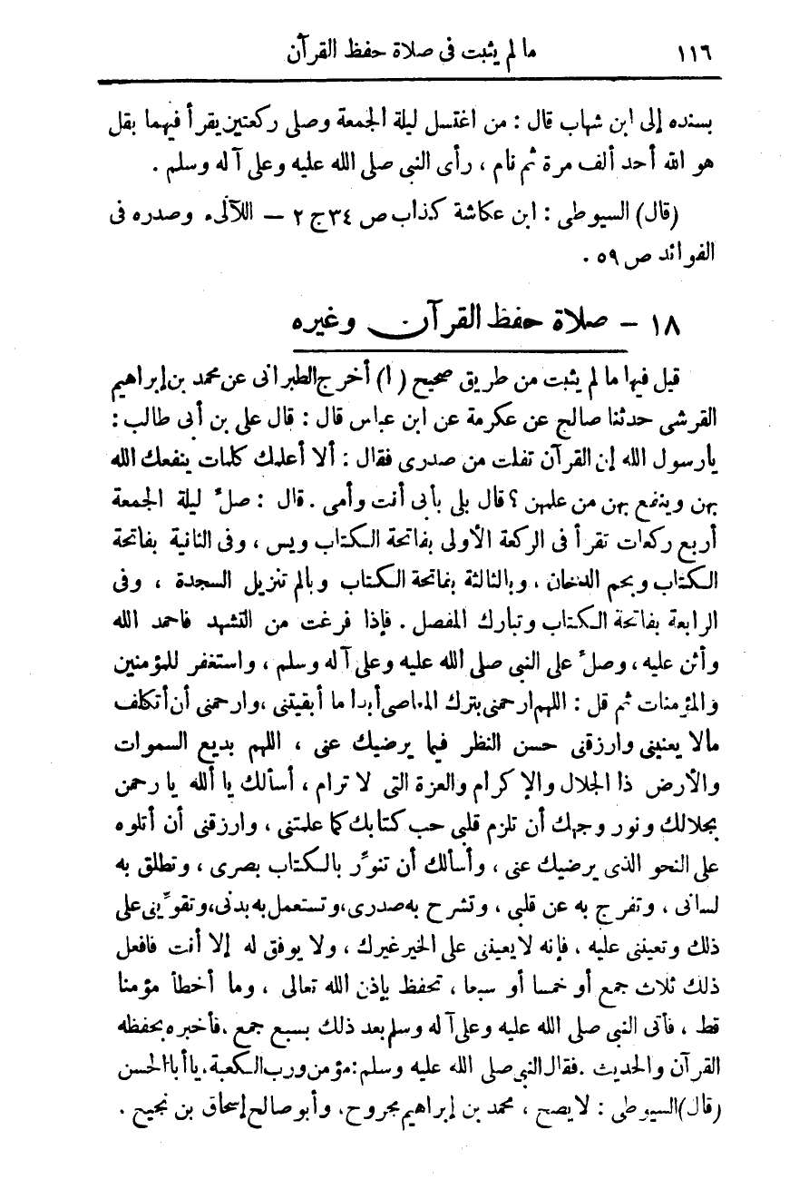 قيل فيها ما لم يثبت (أ) أخرج الطبرانى أنى محمد بن إبراهيم القرشى حدثنا صالح عن عكرمة عن ابن عباس قال: قال على بن أبى طالب: يا رسول الله إن القرآن تفلت من صدرى فقال: ألا أعلمك كلمات ينفعك الله بهن وينفع بهن من علمهن؟ قال بلى بأبي أنت وأمى. قال: صلِّ ليلة الجمعة أربع ركعات تقرأ فى الركعة الأولى بفاتحة الكتاب ويس، وفى الثانية بفاتحة الكتاب وبحم الدخان، وبالثالثة بفاتحة الكتاب وبالم تنزيل السجدة، وفى الرابعة بفاتحة الكتاب وتبارك المفصل. فإذا فرغت من التشهد فاحمد الله وأثن عليه، وصل على النبى صلى الله عليه وعلى آله وسلم، واستغفر للمؤمنين والمؤمنات ثم قل: اللهم ارحمنى بترك المعاصى أبدا ما أبقتنى، وارحمني أن أتكلف مالا يعنينى وارزقنى حسن النظر فيما يرضيك عنى، اللهم بديع السموات والأرض ذا الجلال والإكرام والعزة التى لا ترام، اسالك يا الله يا رحمن بجلالك ونور وجهك أن تلزم قلبى حب كتابك كما علمتنى، وارزقني أن أتلوه على النحو الذى يرضيك عنى، واسالك أن تنوِّر بالكتاب بصرى، وتطلق به لسانى، وتفرح به عن قلبى، وتشرح به صدرى، وتستعمل به بدنى، وتقوينى على ذلك وتعيننى عليه، فإنه لا يعنينى على الخير غيرك، ولا يوفق له إلا أنت فافعل ذلك ثلاث جمع أو خمسا او سبعا، تحفظ بإذن الله تعالى، وما أخطأ مؤمنا قط، فأتى النبى صلى الله عليه وعلى آله وسلم ذلك بسبع جمع، فأخبره بحفظه القرآن والحديث فقال النبى صلى الله عليه وسلم: مؤمن ورب الكعبة، يا ابا الحسن (قال) السيوطى: لا يصح، محمد بن إبراهيم مجروح، وأبو صالح إسحاق بن نجيح.