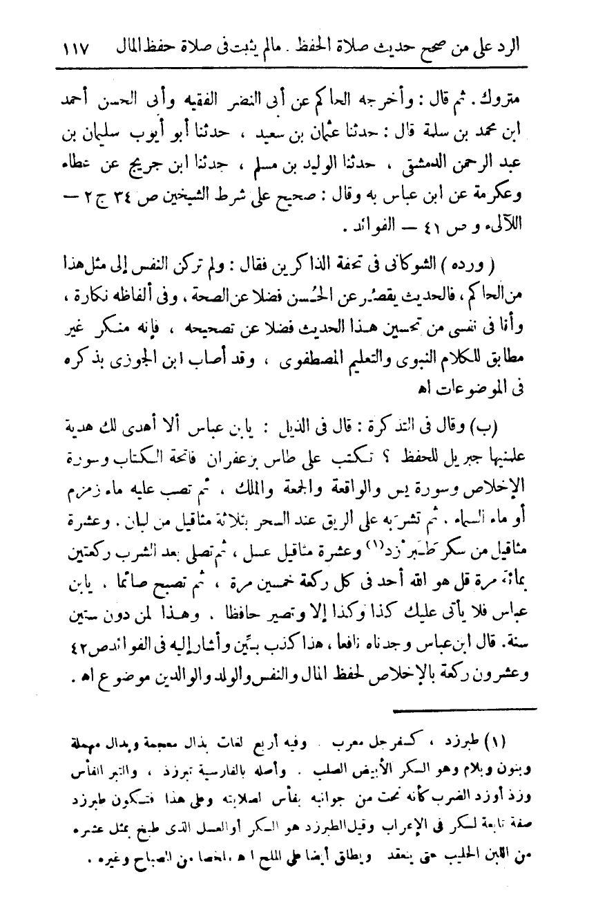 (ب) وقال فى التذكرة: قال فى الذيل: يابن عباس ألا أهدى لك هدية علمنيها جبريل للحفظ؟ تكتب على طاس بزعفران فاتحة الكتاب وسورة الإخلاص وسورة يس وسورة الواقعة والجمعة والملك، ثم تصب عليه ماء زمزم او ماء السماء ثم تشربه على الريق عند السحر بثلاثة مثاقيل من لبان. وعشرة مثاقيل من سكر طبر زد (¬1) وعشرة مثاقيل عسل، ثم تصلى بعد الشرب ركعتين بمائة مرة قل هو الله أحد فى كل ركعة خمسين مرة، ثم تصبح صائما. يابن عباس فلا يأتى عليك كذا وكذا إلا وتصير حافظا. وهذا لمن دون ستين سنة. قال ابن عباس وجدناه نافعا، هذا كذب بين وأشار إليه فى الفوائد ص 42 وعشرون ركعة بالإخلاص لحفظ المال والنفس والولد والوالدين موضوعات أهـ.