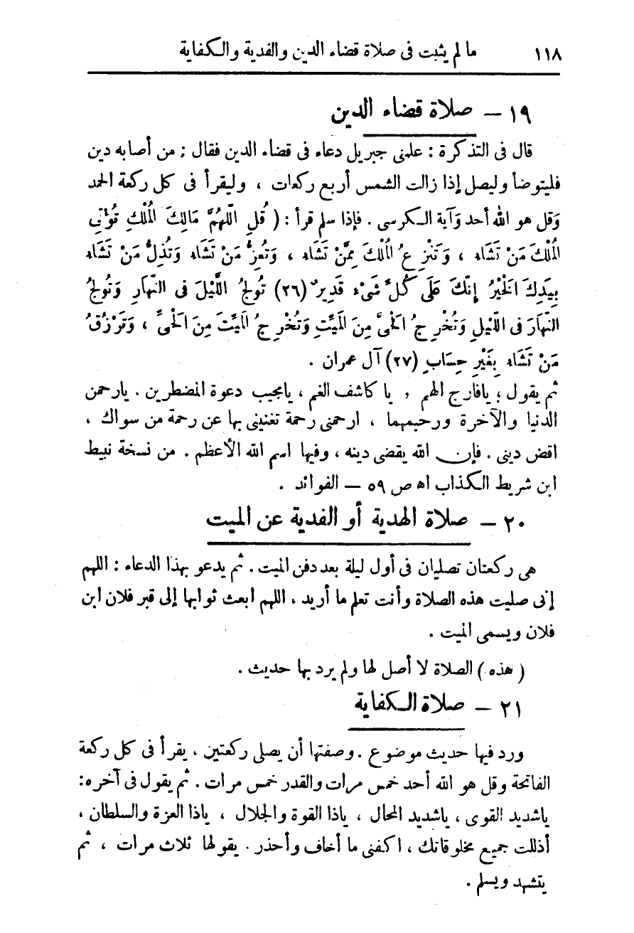 قال فى التذكرة: علمنى جبريل دعاء فى قضاء الدين فقال: من أصابه دين فليتوضأ وليصل إذا زالت الشمس أربع ركعات، وليقرأ فى كل ركعة الحمد وقل هو الله أحد وآية الكرسى. فإذا سلم قرأ: {قُلِ اللَّهُمَّ مَالِكَ المُلْكِ تُؤْتِي المُلْكَ مَن تَشَاءُ وَتَنزِعُ المُلْكَ مِمَّن تَشَاءُ وَتُعِزُّ مَن تَشَاءُ وَتُذِلُّ مَن تَشَاءُ بِيَدِكَ الخَيْرُ إِنَّكَ عَلَى كُلِّ شَيْءٍ قَدِيرٌ {26} تُولِجُ اللَّيْلَ فِي الْنَّهَارِ وَتُولِجُ النَّهَارَ فِي اللَّيْلِ وَتُخْرِجُ الْحَيَّ مِنَ الْمَيِّتِ وَتُخْرِجُ الَمَيَّتَ مِنَ الْحَيِّ وَتَرْزُقُ مَن تَشَاء بِغَيْرِ حِسَابٍ} {27} آل عمران.