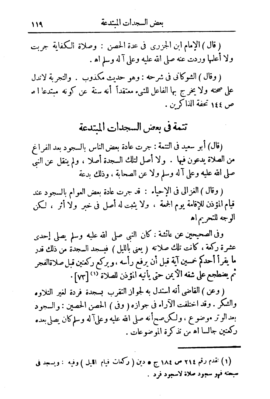 (قال) أبو سعيد فى التتمة: جرت عادة بعض الناس بالسجود بعد الفراغ من الصلاة يدعوة فيها. ولا اصل لتلك السجدة أصلا، ولم ينقل عن النبى صلى الله عليه وعلى آله وسلم ولا عن الصحابة وذلك بدعة