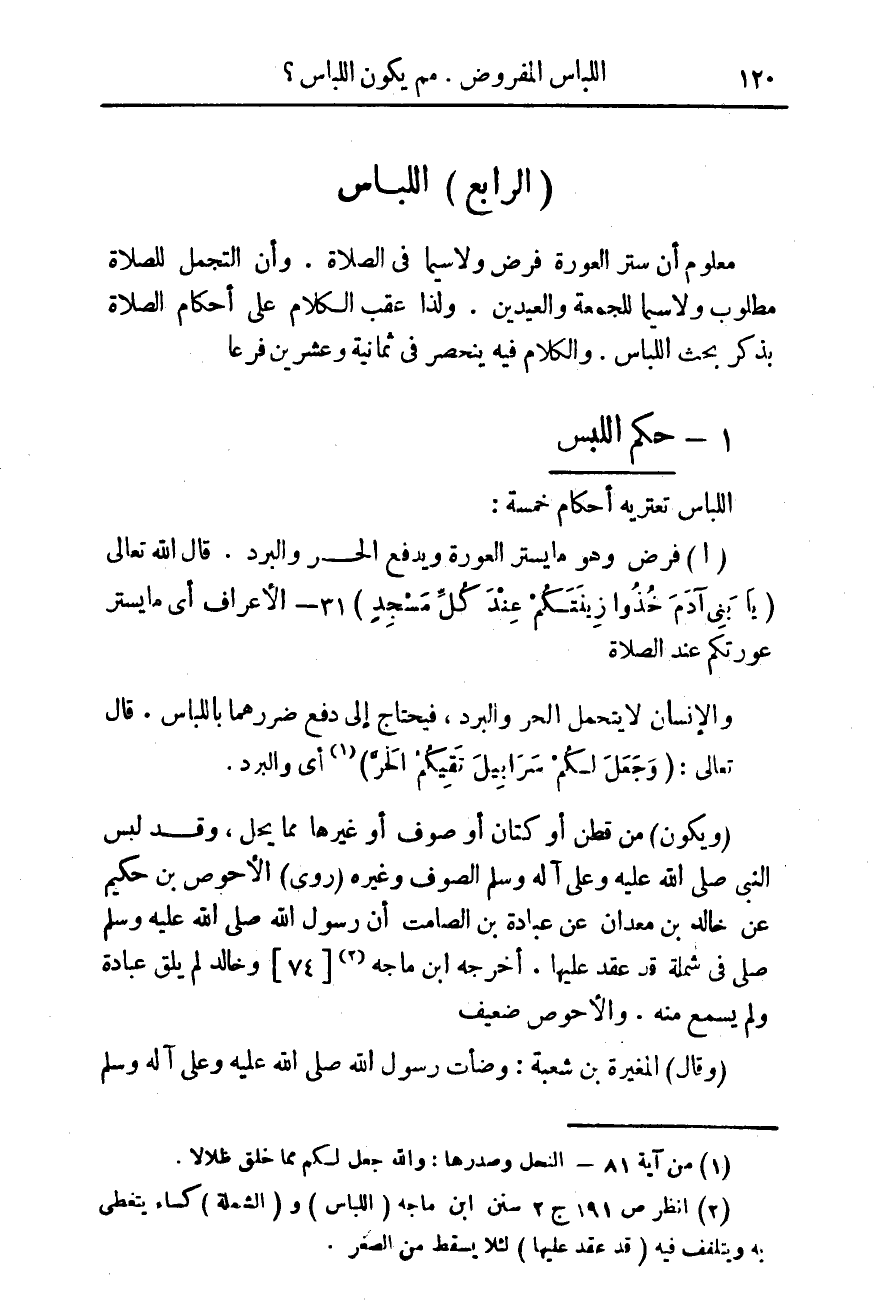 معلوم أن ستر العورة فرض ولا سيما فى الصلاة. وأن التجمل للصلاة مطلوب ولا سيما للجمعة والعيدين. ولذا عقب الكلام على أحكام الصلاة بذكر يحث اللباس. والكلام فيه ينحصر فى ثمانية وعشرين فرعا.