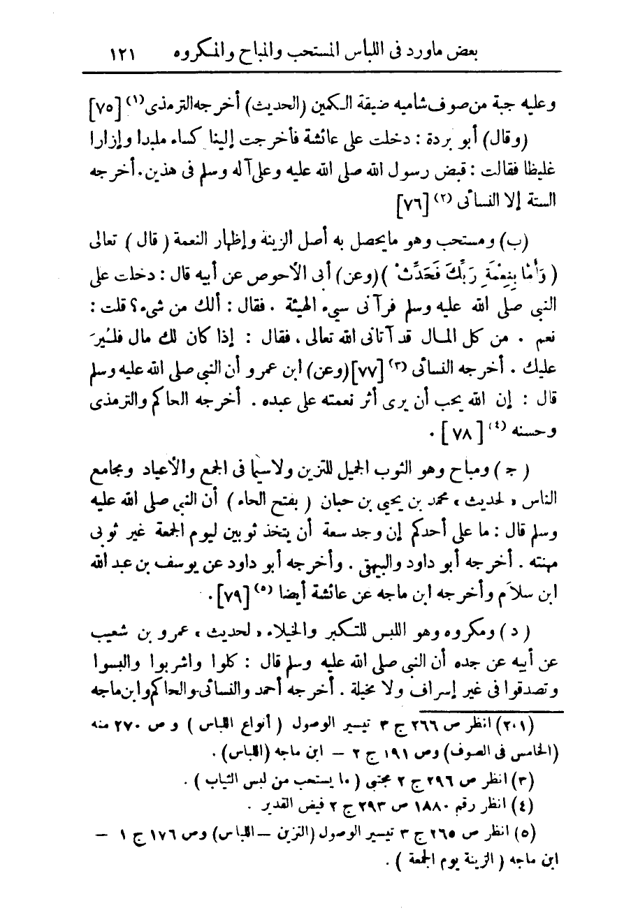 (¬1) انظر ص 266 ج 3 تيسير الوصول (أنواع اللباس) وص 270 منه (الخامس فى الصوف) وص 191 ج 2 - ابن ماجه (اللباس).