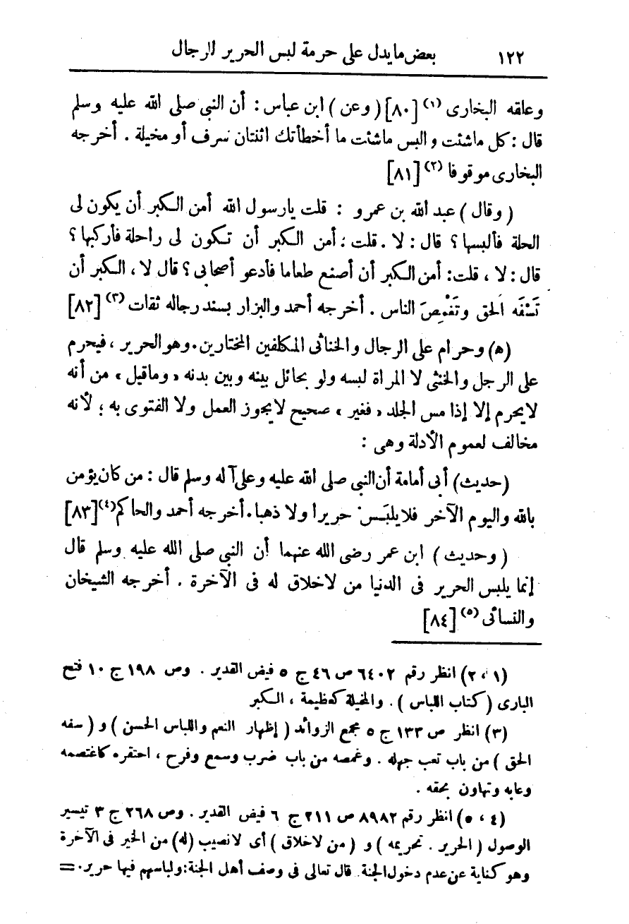 (حديث) ابى أمامة أن النبى صلى الله عليه وعلى آله وسلم قال: من كان يؤمن بالله واليوم الآخر فلا يلبس حريرا ولا ذهبا. أخرجه أحمد والحاكم (¬3) {83}.