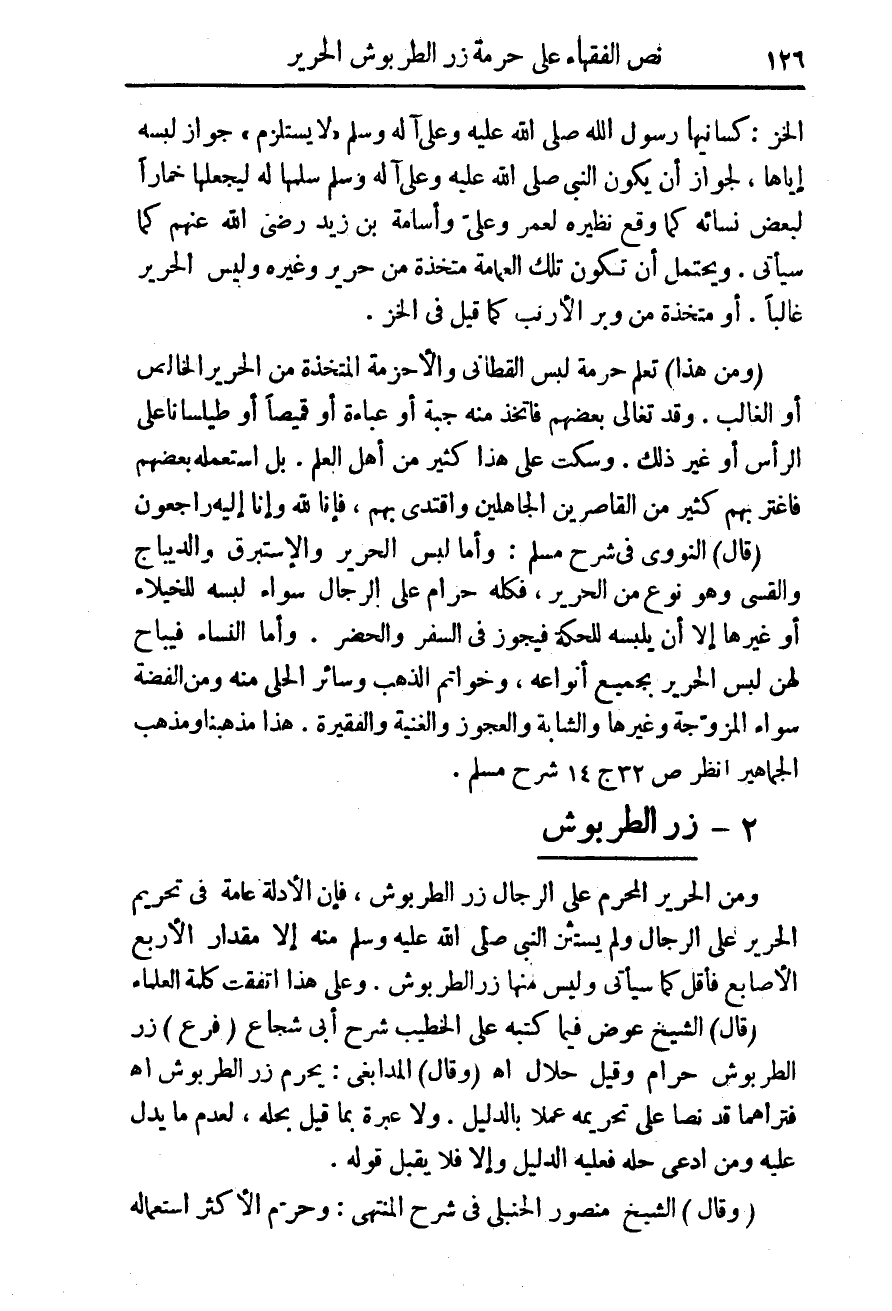 ومن الحرير المحرم على الرجال زر الطربوش، فإن الأدلة عامة فى تحريم الحرير على الرجال ولم يستثن النبى صلى الله عليه وسلم منه إلا مقدار الأربع الأصابع فاقل كما سيأتى وليس منها زر الطربوش. وعلى هذا اتفقت كلمة العلماء.