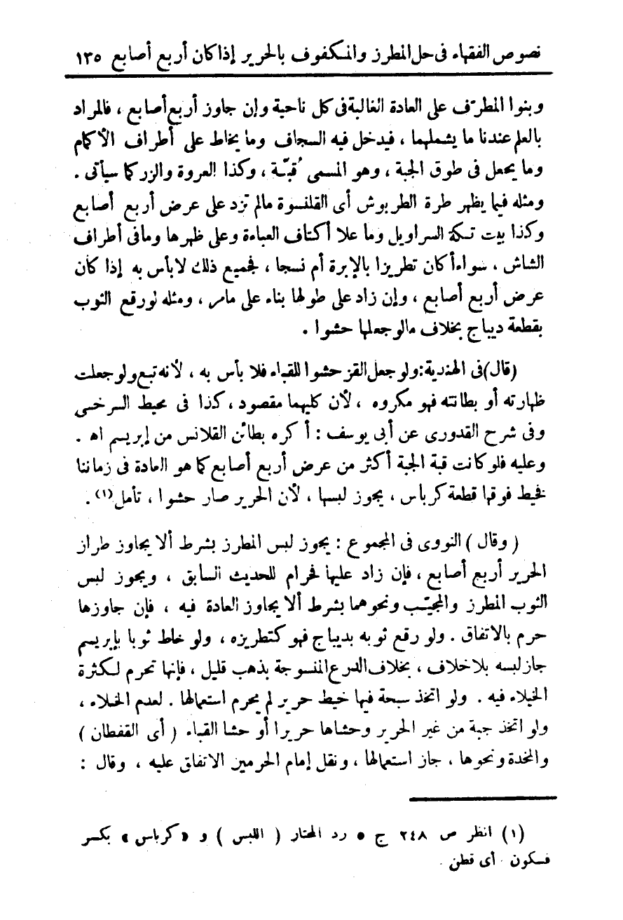 (وقال) النووى فى المجموع: يجوز لبس المطرز بشرط ألا يجاوز طراز الحرير أربع أصابع، فإن زاد عليها فحرام للحديث السابق، ويجوز لبس الثوب المطرز والمجيّب ونحوهما بشرط ألا يجاوز العادة فيه، فإن جاوزها حرم بالاتفاق. ولو رقع ثوبه بديباج فهو كتطريزة، ولو خلط ثوبا بإبريسم جاز لبسه بلا خلاف، بخلاف الدرع المنسوجة بذهب قليل، فإنها تحرم لكثرة الخيلاء فيه. ولو اتخذ سبحة فيها خيط حرير لم يحرم استعمالها. لعدم الخلاء، ولو اتخذ جبة من غير الحرير وحشاها حريرا أو حشاء القباء (أى القفطان) والمخدة ونحوها، جاز استعمالها، ونقل إمام الحرمين الاتفاق عليه، وقال: