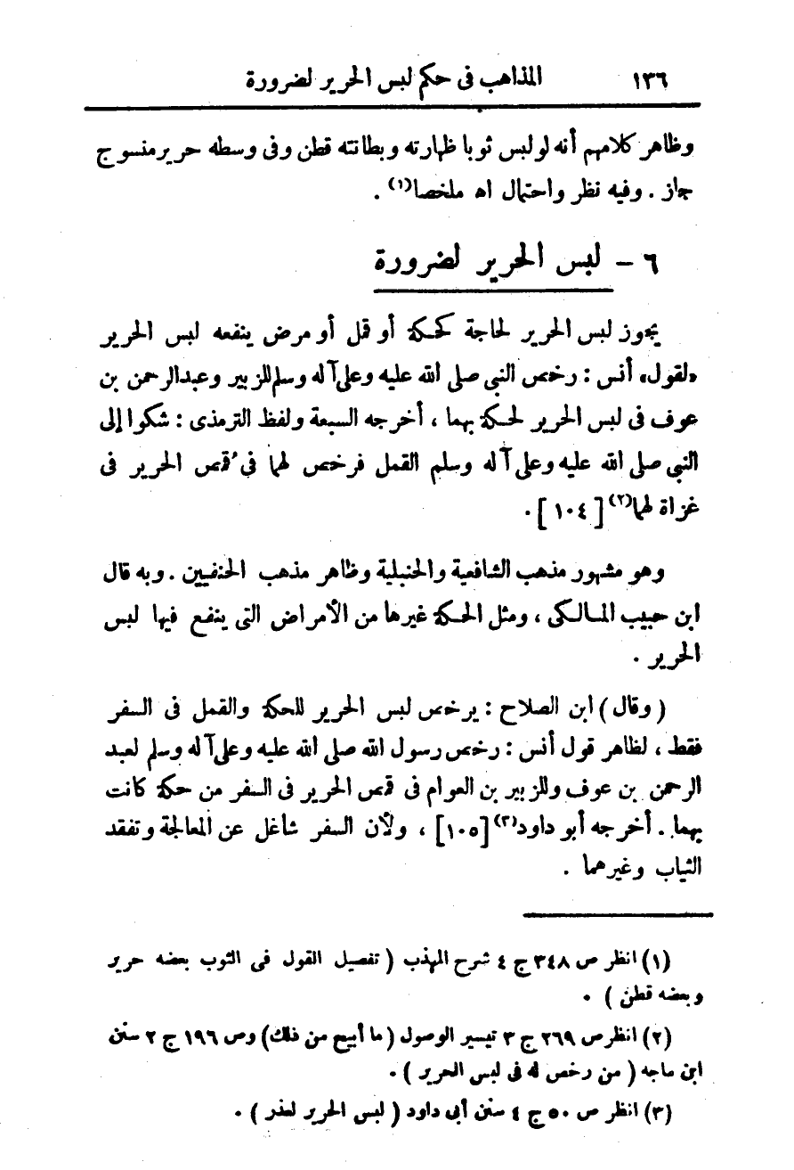 يجوز لبس الحرير لحاجة كحكة أو قمل أو مرض ينفعه لبس الحرير " لقول " أنس: رخص النبى صلى الله عليه وعلى آله وسلم للزبير وعبد الرحمن بن عوف فى لبس الحرير لحكة بهما، أخرجه السبعة ولفظ الترمذى: شكو إلى النبى صلى الله عليه وعلى آله وسلم القمل فرخص لهما فى قُمص الحرير فى غزاة لهما (¬2) {104}