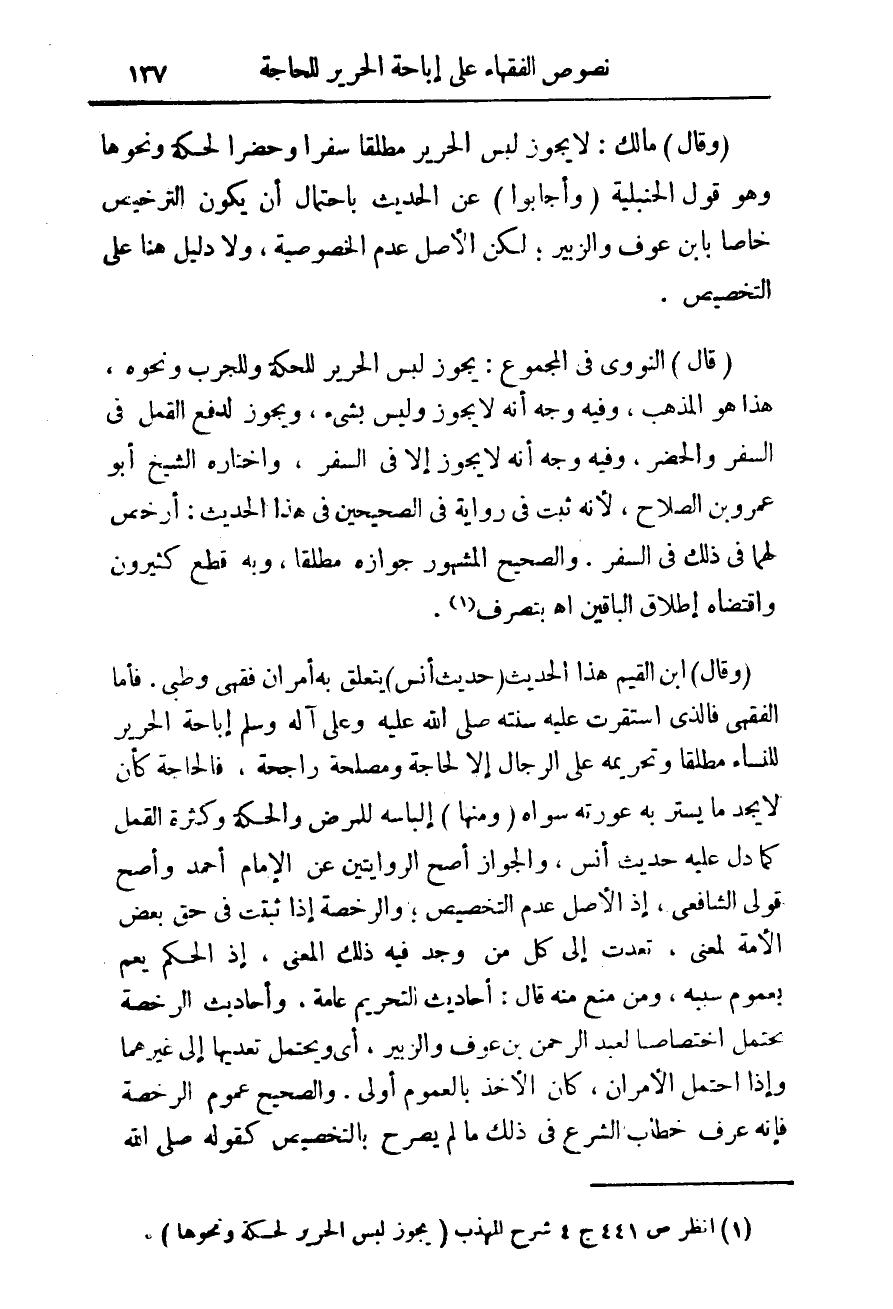 (قال) النووى فى المجموع: يجوز لبس الحرير للحكة وللجرب ونحوه، هذا هو المذهب، وفيه وجه أنه لا يجوز وليس بشيئ , ويجوز لدفع القمل في السفر والحضر , وفيه وجه أنه لا يجوز إلا في السفر , واختاره الشيخ أبو عمرو بن صلاح , لأنه ثبت في روايه في الصحيحين قي هذا الحديث , أرخص لهما في ذلك السفر , والصحيح المشهور جوازه مطلقا , وبه قطع كثيرون واقتضاه إطلاق الباقين أهـ بتصرف واحد (¬1).