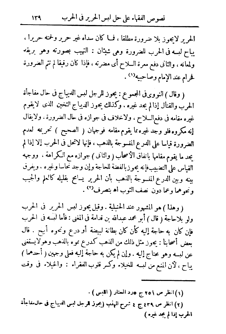 (¬2) انظر ص 439 ج 4 شرح المهذب (يجوز للرجل لبس الديباج فى حال مفاجأة الحرب إذا لم يجد غير هـ).