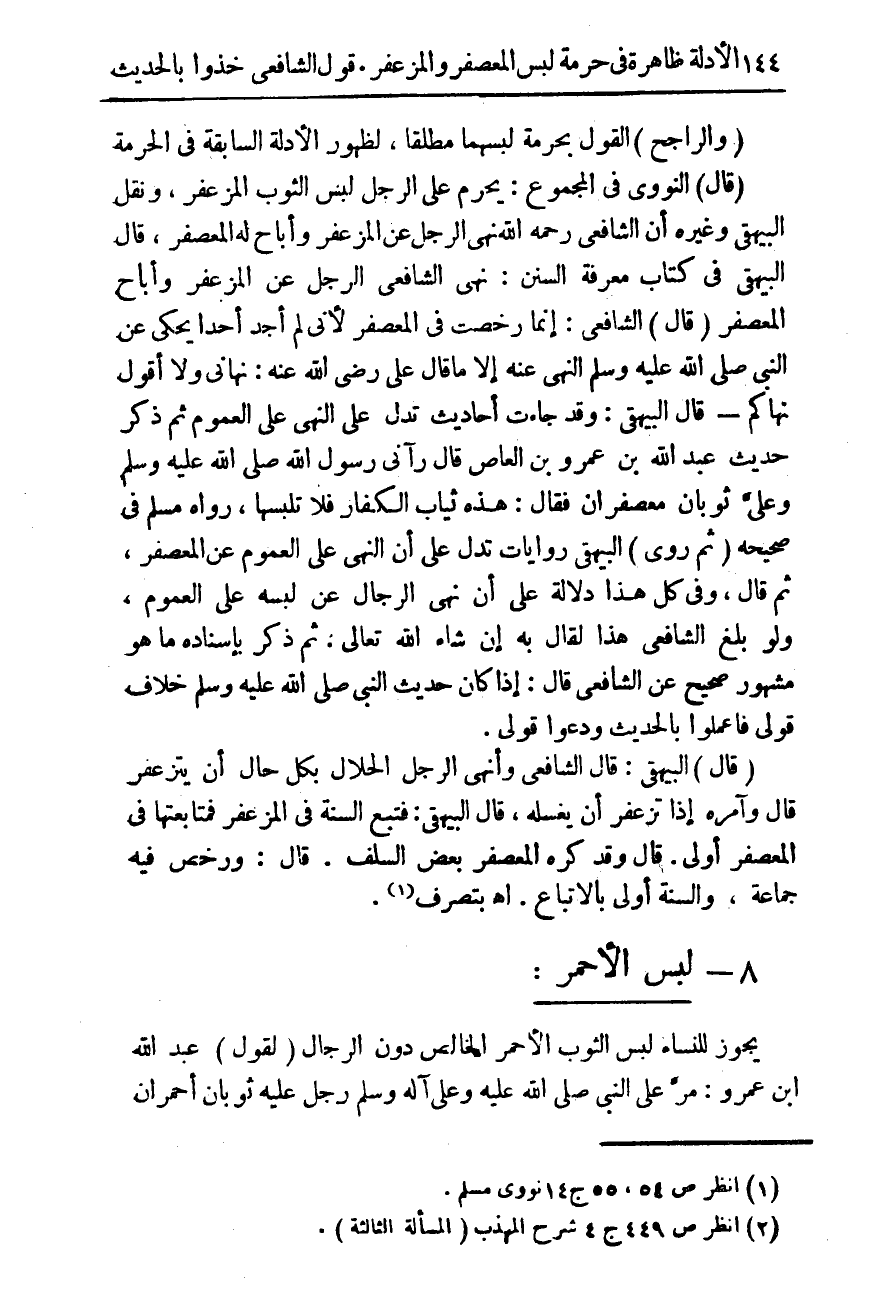 (قال) النووى فى المجموع: يحرم على الرجل لبس الثوب المزعفر، ونقل البيهقى وغيره أن الشافعى رحمة الله نهى الشافعى الرجل عن المزعفر واباح المعصفر (قال) الشافعى: إنما رخصت فى المعصفر لأنى لم أجد أحدا يحكى عن النبى صلى الله عليه وسلم النهى عنه إلا ما قال على رضى الله عنه: نهانى ولا أقول نهاكم - قال البيهقى: وقد جاءت أحاديث تدل على النهى على العموم ثم ذكر حديث عبد الله بن عمرو بن العاص قال رأنى رسول الله صلى الله عليه وسلم وعلى ثوبان معصفران فقال: هذه ثياب الكفار فلا تلبسها، رواه مسلم فى صحيحه (ثم روى) البيهقى روايات تدل على أن نهى الرجال عن لبسه على العموم، ولو بلغ الشافعى هذا لقال به إن شاء الله تعالى: ثم ذكر بإسناده ما هو مشهور صحيح عن الشافعى قال: إذا كان حديث النبى صلى الله عليه وسلم خلاف قولى فاعملوا بالحديث ودعوا قولى.