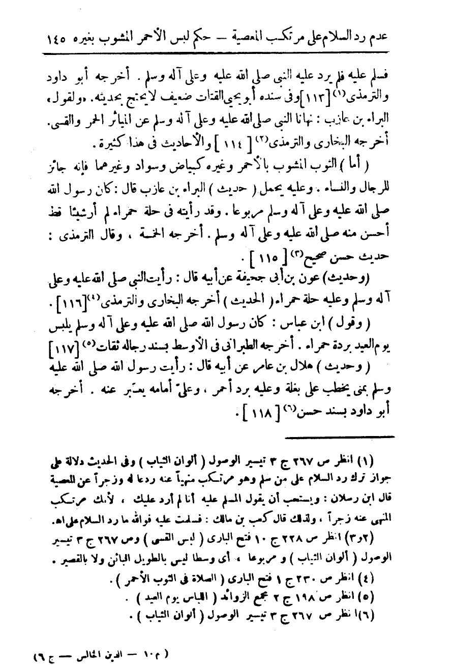 (¬1) انظر ص 267 ج 3 تيسير الوصول (ألوان الثياب) وفى الحديث دلالة على جواز ترك رد السلام على من سلم وهو مرتكب منهيا عنه ردعا له وزجرا عن المعصية قال ابن رسلان: ويستحب أن يقول المسلم عليه أنا لم ارد عليك، لأنك مرتكب المنهى عنه زجرا، ولذلك قال كعب بن مالك: فسلمت عليه فوالله ما رد السلام على أهـ.