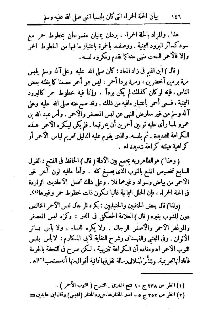 (قال) ابن القيم فى زاد المعاد: كان صلى الله عليه وعلى آله وسلم يلبس مرة بردين أخضرين، ومرة بردا أحمر، ليس هون أحمر مصمتا كما يظنه بعض الناس، فإنه لو كان كذلك لم يكن برداً، وإنما فيه خطوط حمر كالبرود اليمنية، فسمى أحمر باعتبار ما فيه من ذلك. وقد صح عنه صلى الله عليه وعلى آله وسلم من غير معارض النهى عن لبس المعصفر والأحمر. وأمر عبد الله بن عمرو لما رأى عليه ثوبين أحمرين أن يحرقهما. فلم يكن ليكره الأحمر هذه الكراهة الشديدة ثم يلبسه. والذى يقوم عليه بالدليل تحريم لباس الأحمر أو كراهية هيئته كراهة شديدة أهـ.