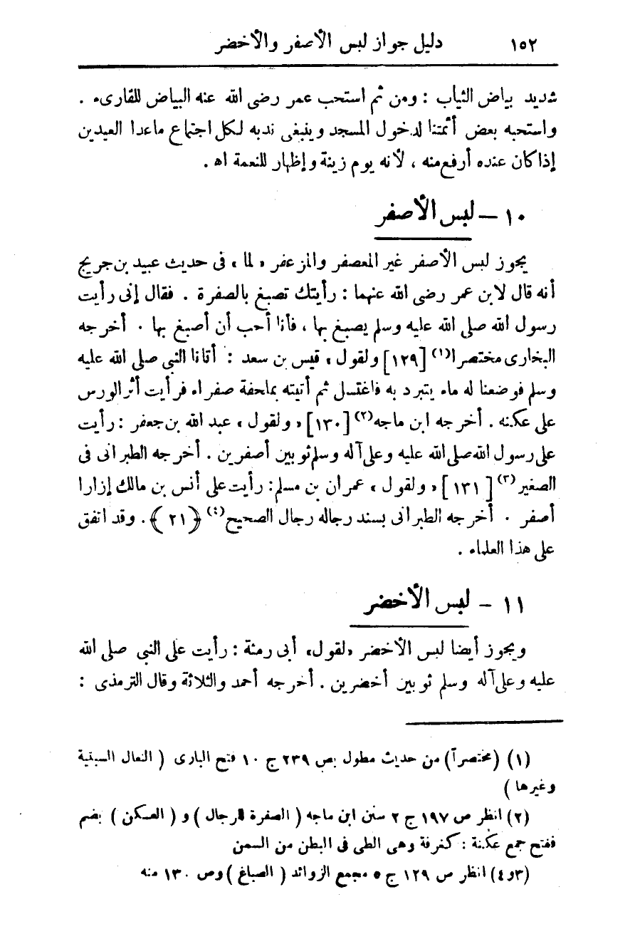 يجوز لبس الأصفر غير المعصفر والمزعفر " لما " فى حديث عبيد بن جريح أنه قال لابن عمر رضى الله عنهما: رأيتك تصبغ بالصفرة. فقال إنى رأيت رسول الله صلى الله عليه وسلم يصبغ بها، فأنا أحب ان أصبغ بها. أخرجه البخارى مختصرا (¬1) {129} " ولقول " قيس بن سعد: أتانا النبى صلى الله عليه وسلم فوضعنا له ماء يتبرد فاغتسل ثم أتيته بملحفة صفراء فرأيت أثر الورس على عكنة. أخرجه ابن ماجه (¬2) {130} " ولقول" عبد الله بن جعفر: رأيت على رسول الله صلى الله عليه وعلى آله وسلم ثوبين أصفرين. أخرجه الطبرانى فى الصغير (¬3) {131} " ولقول " عمران بن مسلم: رأيت على أنس بن مالك إزارا أصفر. أخرجه الطبرانى بسند رجاله رجال الصحيح (¬4) {21} وقد اتفق على هذا العلماء.