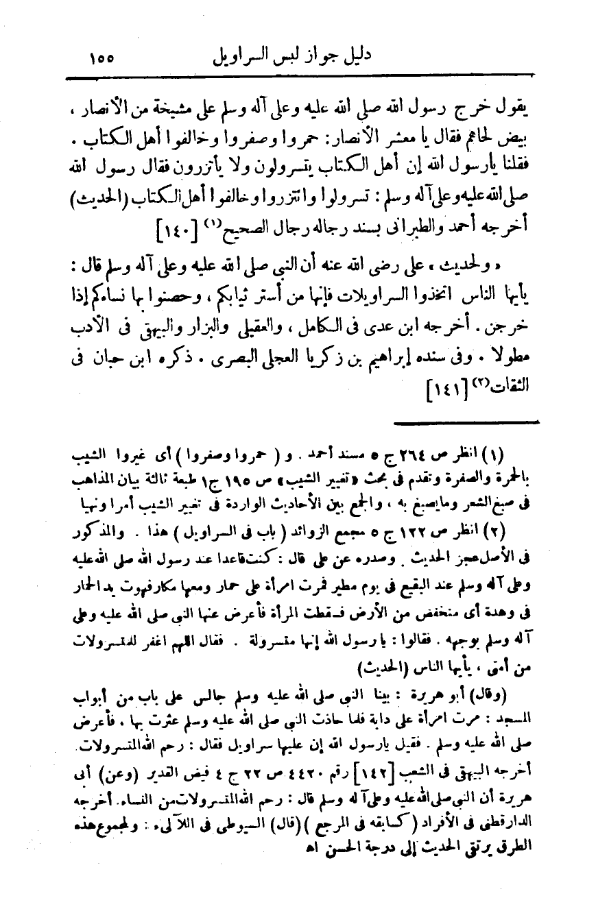 يقول خرج رسول الله صلى الله عليه وعلى آله وسلم على مشيخة من الأنصار، بيض لحاهم فقال يا معشر الأنصار: حمروا وصفروا وخالفوا أهل الكتاب. فقلنا يا رسول الله إن أهل الكتاب يتسرولوا ولا ياتزرون فقال رسول الله صلى الله عليه وعلى آله وسلم: تسرولوا وائتزروا وخالفوا أهل الكتاب (الحديث) أخرجه أحمد والطبرانى بسند رجاله رجال الصحيح (¬1) {140}