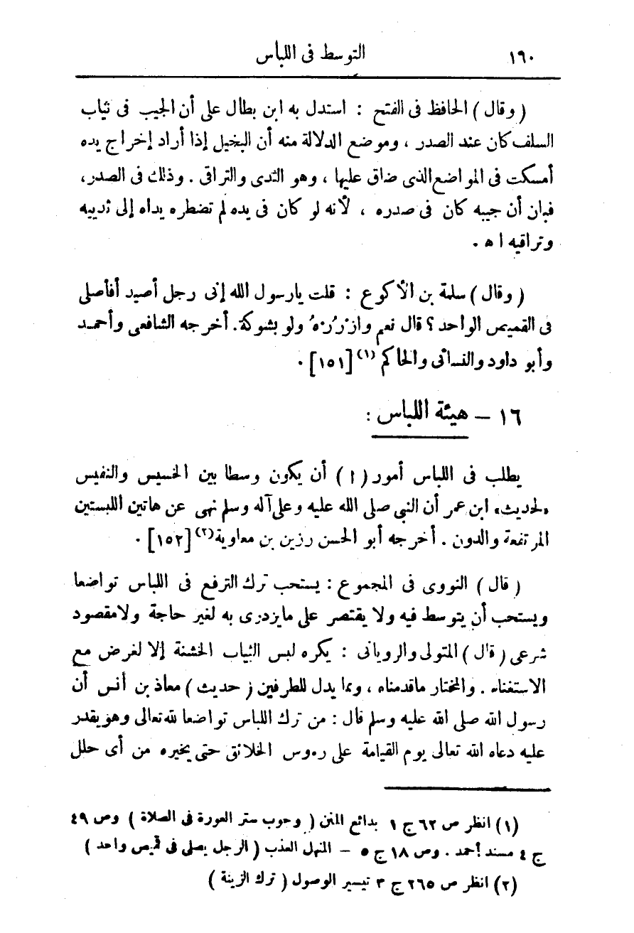 يطلب فى اللباس أمور (أ) أن يكون وسطا بين الخسيس والنفيس "لحديث" ابن عمر أن النبى صلى الله عليه وعلى آله وسلم نهى عن هاتين اللبستين المرتفعة والدون. أخرجه أبو الحسن رزين بن معاوية (¬2) {152}.