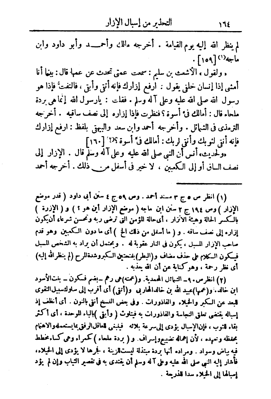 " ولقول " الأشعث بن سليم: سمعت عمتى تحدث عن عمها قال: بينما أنا أمشى إذا إنسان خلفى يقول: أرفع إزارك فإنه أتقى وأبقى، فالتفتُّ فإذا هو رسول الله صلى الله عليه وعلى آله وسلم. فقلت: يا رسول الله إنما هى بردة ملحاء قال: أمالك فىَّ أسوة؟ فنظرت فإذا إزاره إلى نصف ساقيه. أخرجه الترمذى فى الشمائل. وأخرجه أحمد وابن سعد والبيهقى بلفظ: ارفع إزارك فإنه أنقى لثوبك وأنقى لربك: أمالك فىَّ أسوة؟ (¬2) {160}