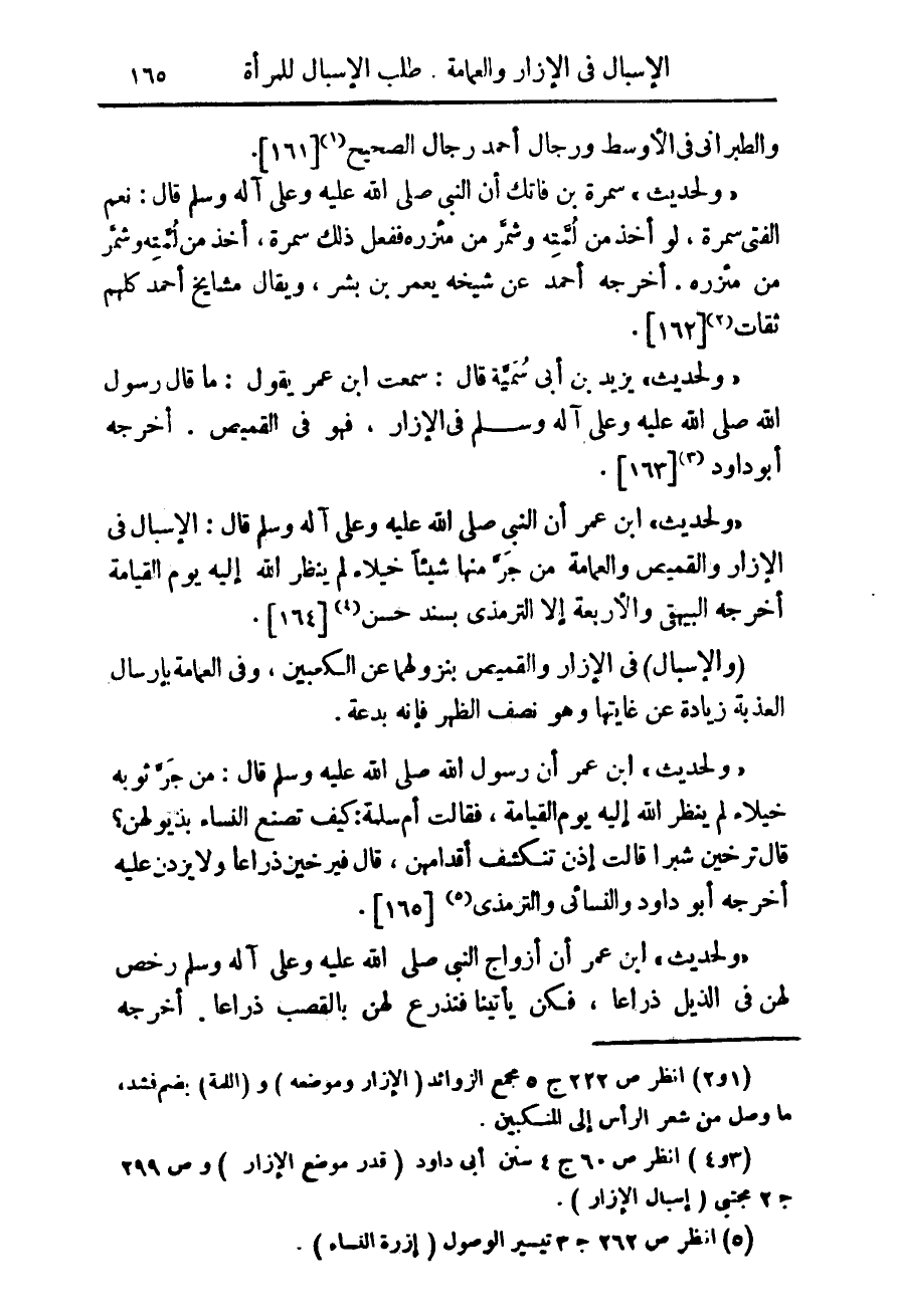 " ولحديث " ابن عمر أن رسول الله صلى الله عليه وسلم قال: من جَرَّ ثوبه خيلاء لم ينظر الله إليه يوم القيامة، فقالت أم سلمة: كيف تصنع النساء بذيولهن؟ قال ترخين شبرا قالت إذن تنكشف أقدامهن، قال فيرخين ذراعا ولا يزدن عليه أخرجه ابو داود والنسائى والترمذى (¬5) {165}.